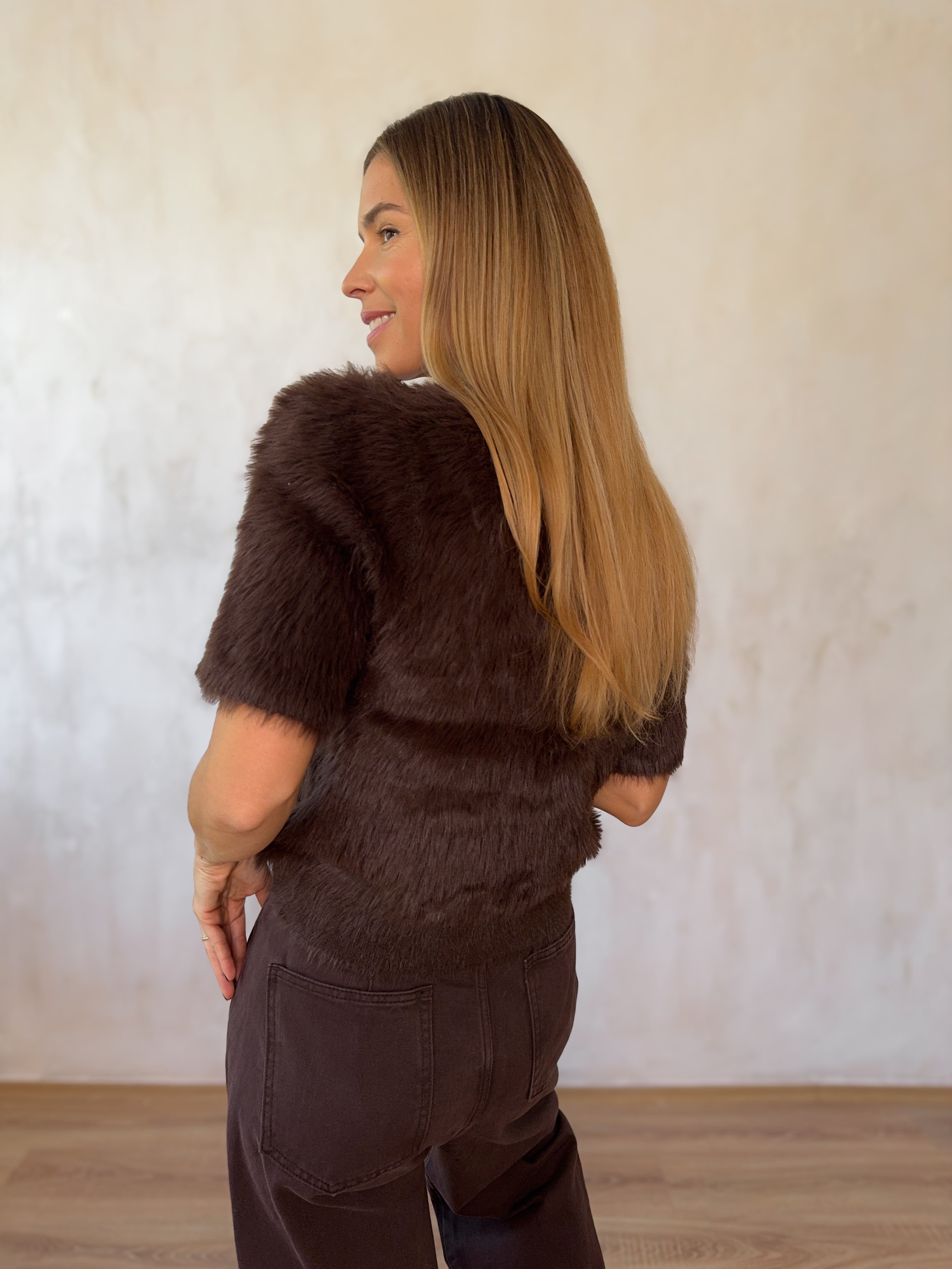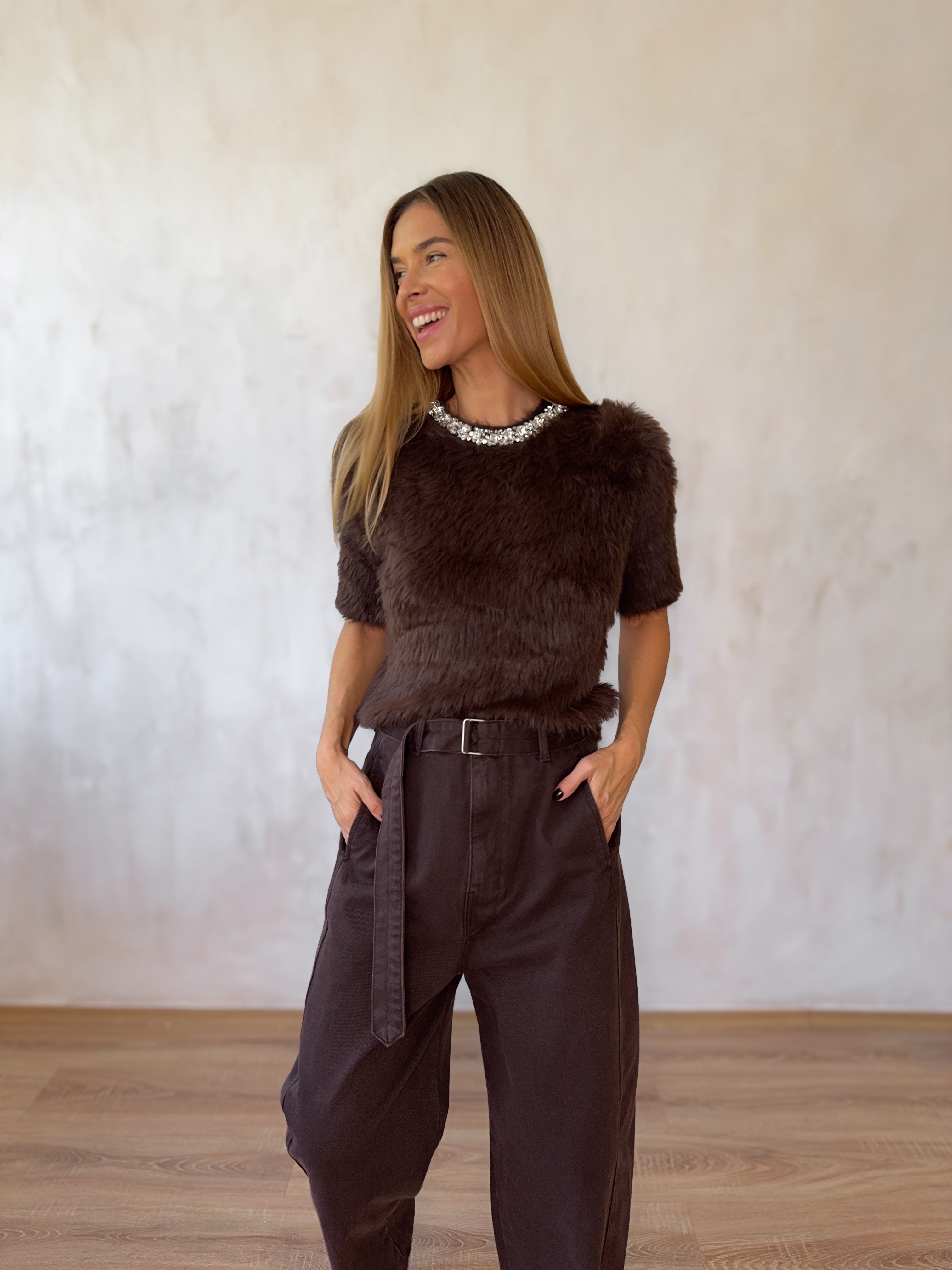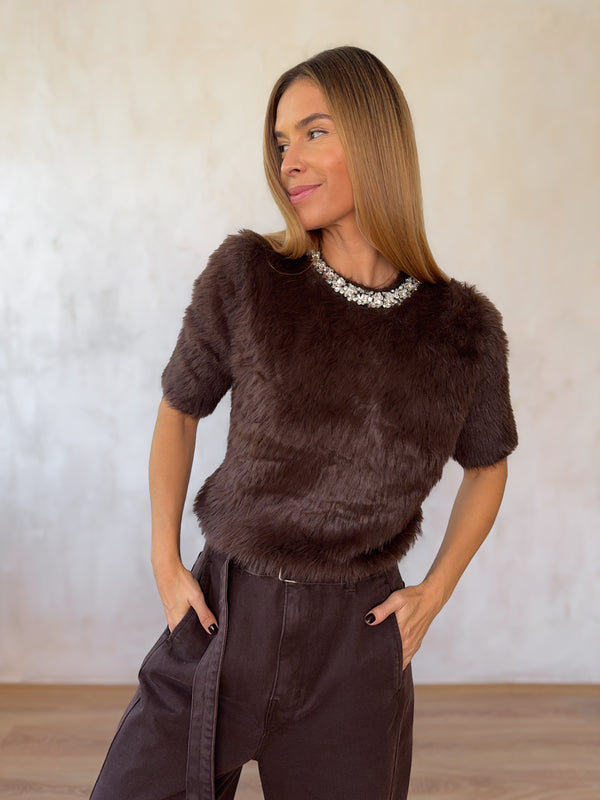 Műszőrméből készült rövidujjú felső kövekkel díszítve.