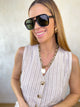 Sötét lencséjű, vagány, szögletes fazonú napszemüveg. Napszemüvegeink UV szűrősek! Tokban, puha kendővel ellátva kerülnek kiszállításra!