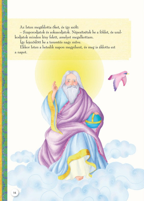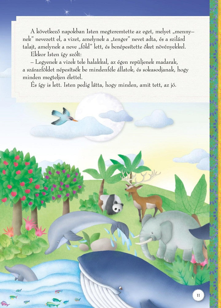A könyv lapjain a világ teremtésétől kezdve Jézus életéig és haláláig találunk az Ószövetségből és az Újszövetségből hetvennél is több történetet. Minden egyes történet magával ragadóan elevenedik meg az olvasók előtt, miközben az illusztrációk segítségével könnyebben elmerülhetünk a történetek világában. A színes és részletgazdag képek segítik az olvasmányok befogadását, és abban is segítenek a gyerekeknek, hogy jobban megértsék és megszeressék a Bibliát.