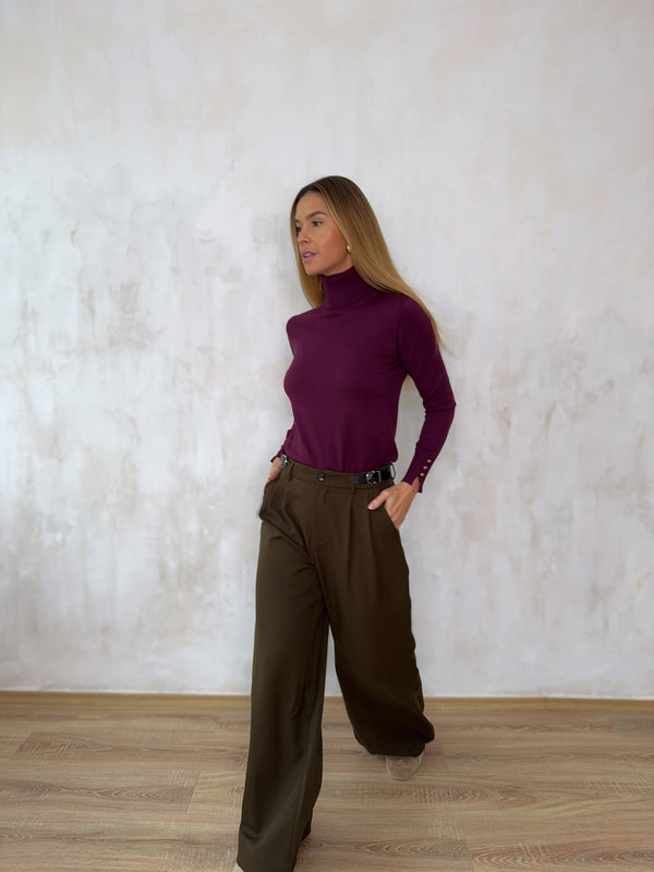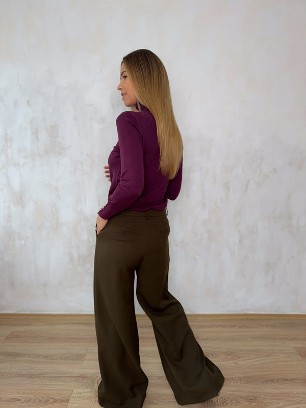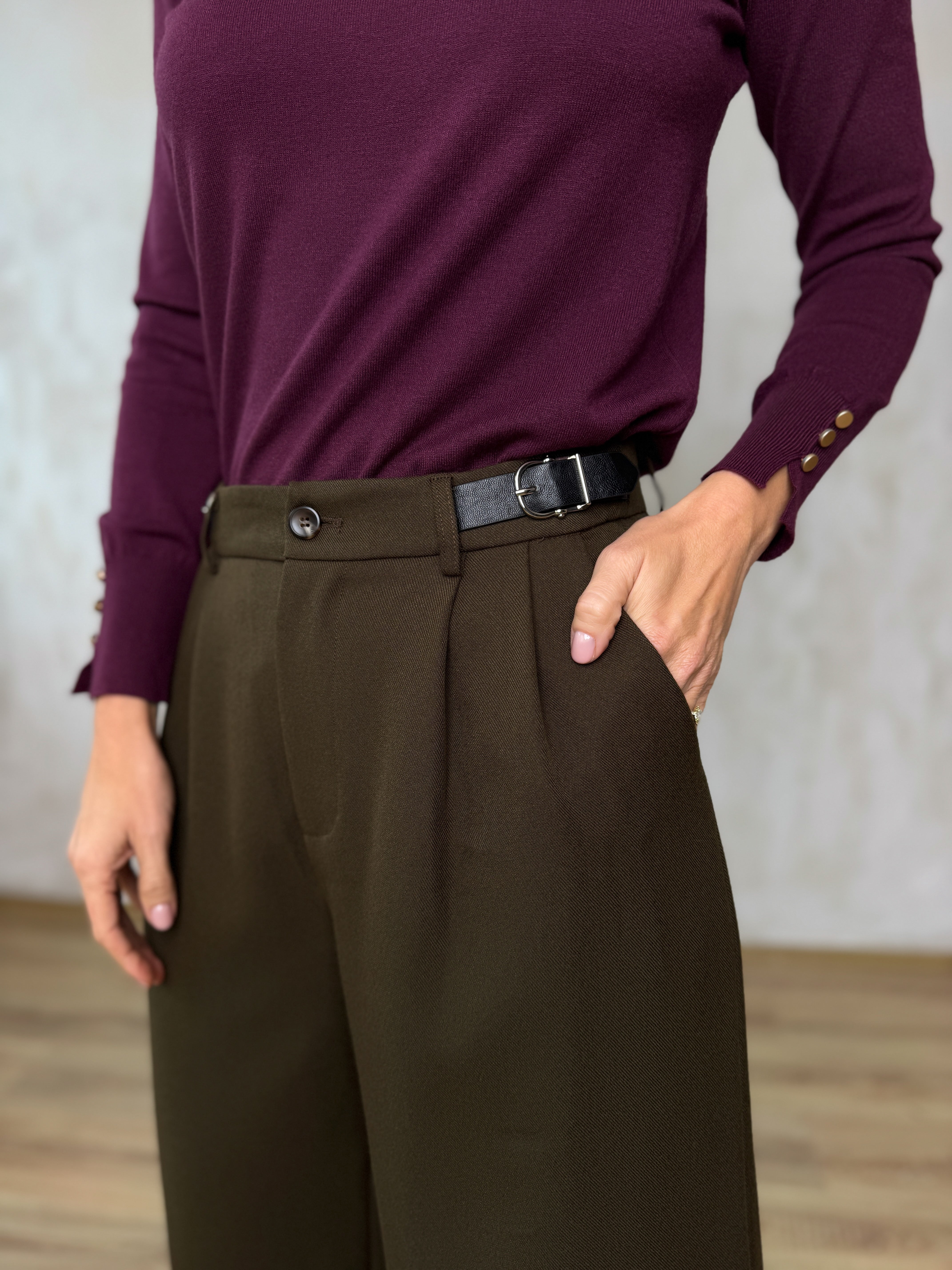 Bő szárú, khaki nadrág oldalán csatokkal.