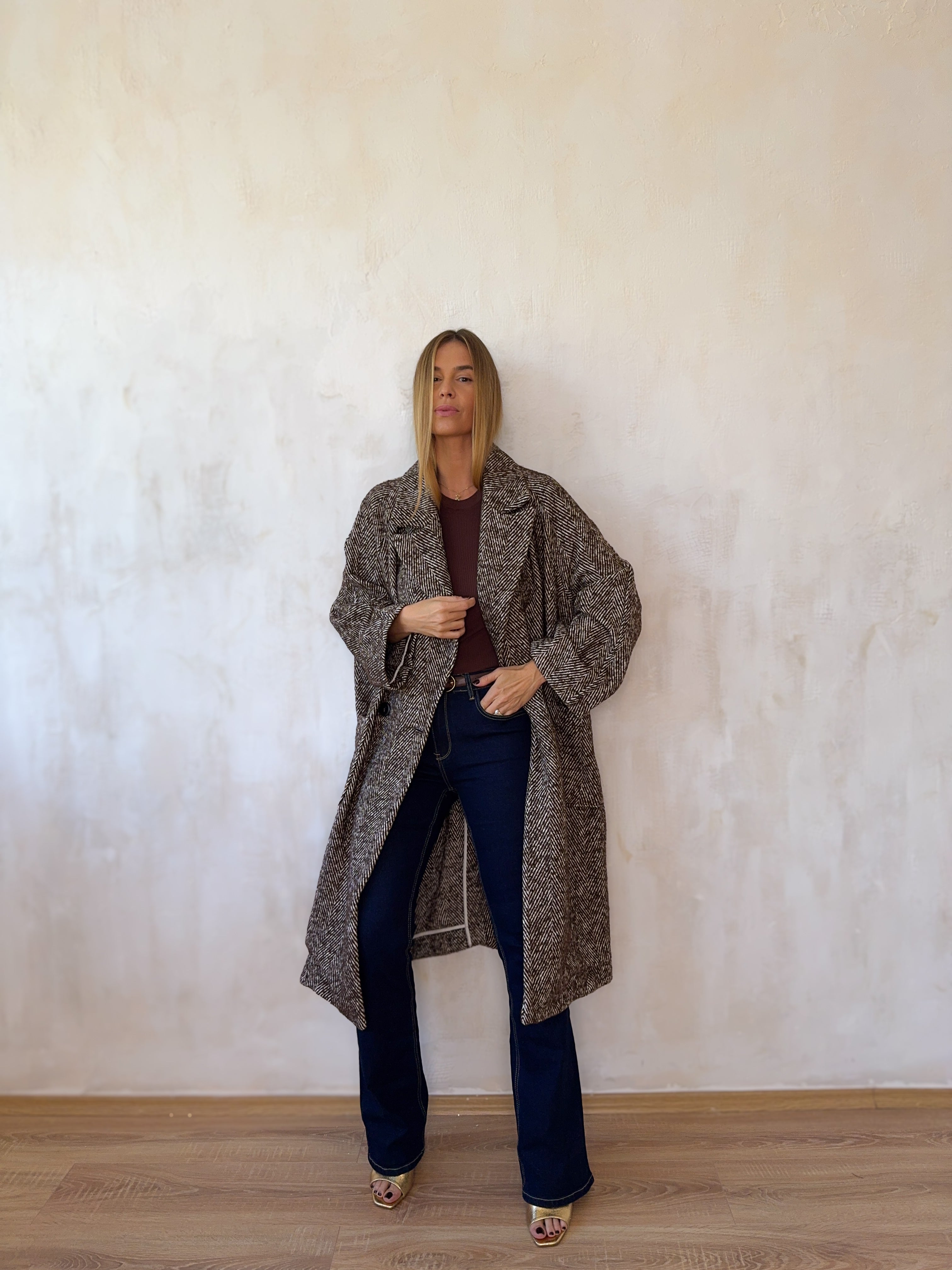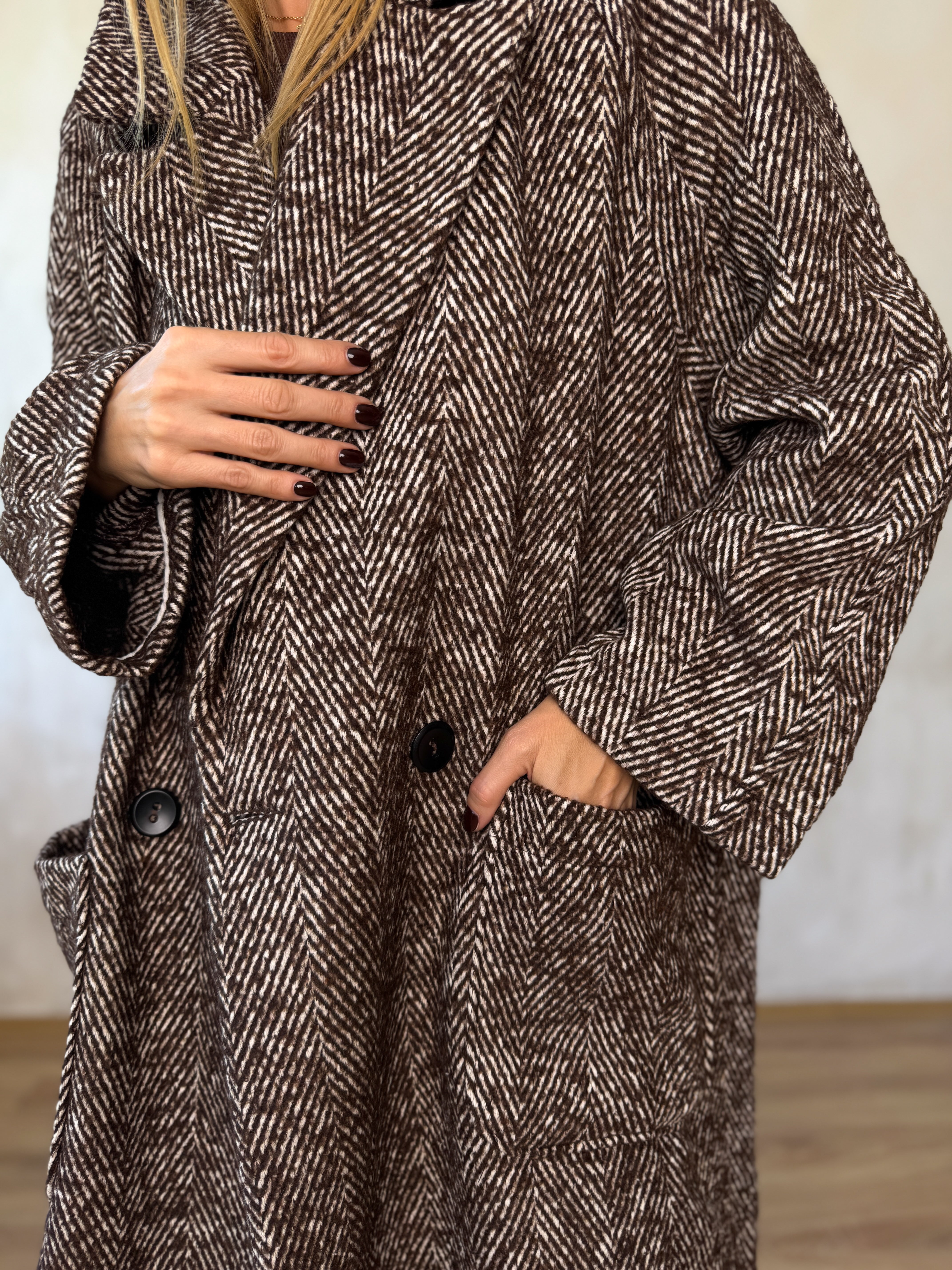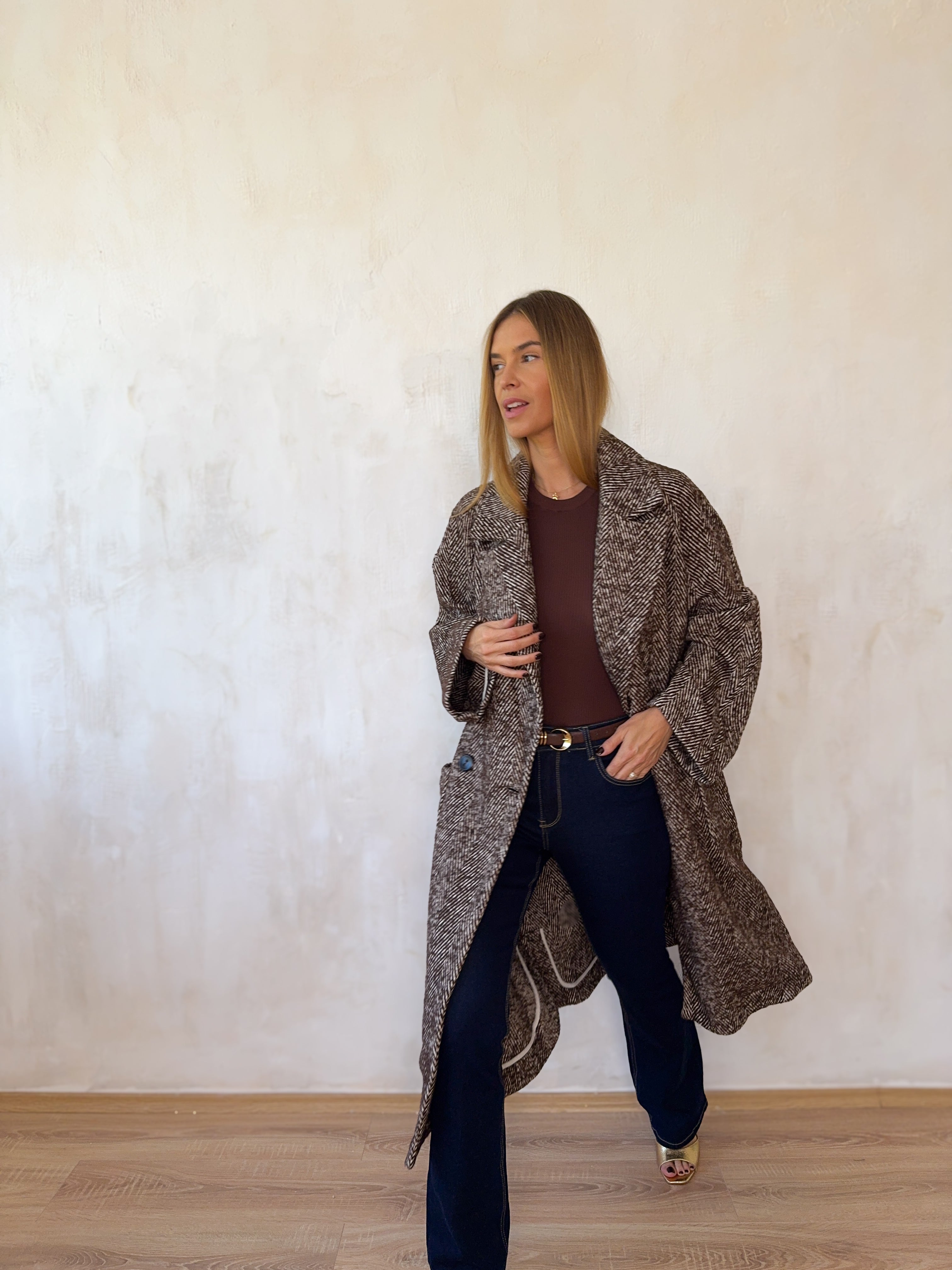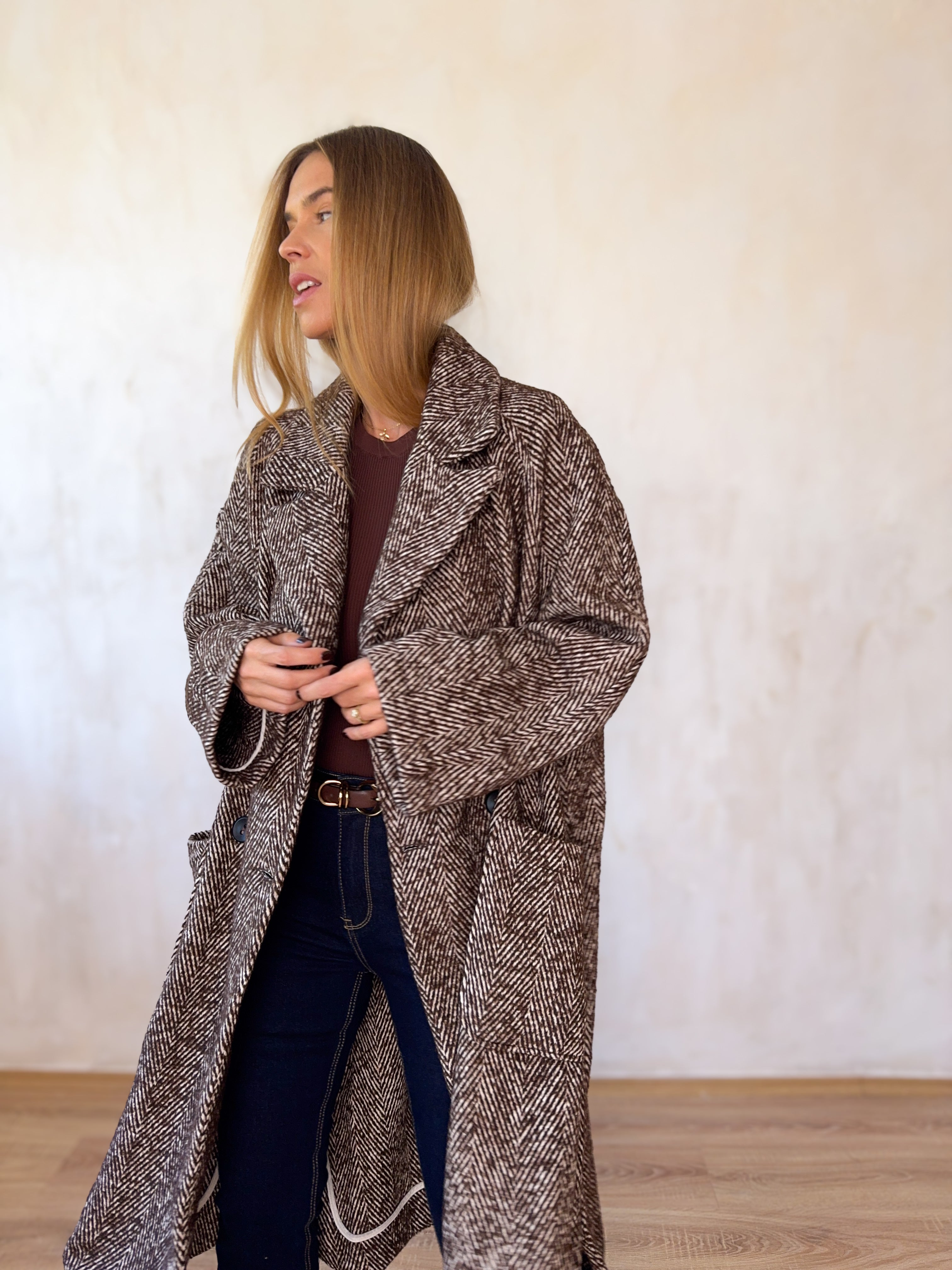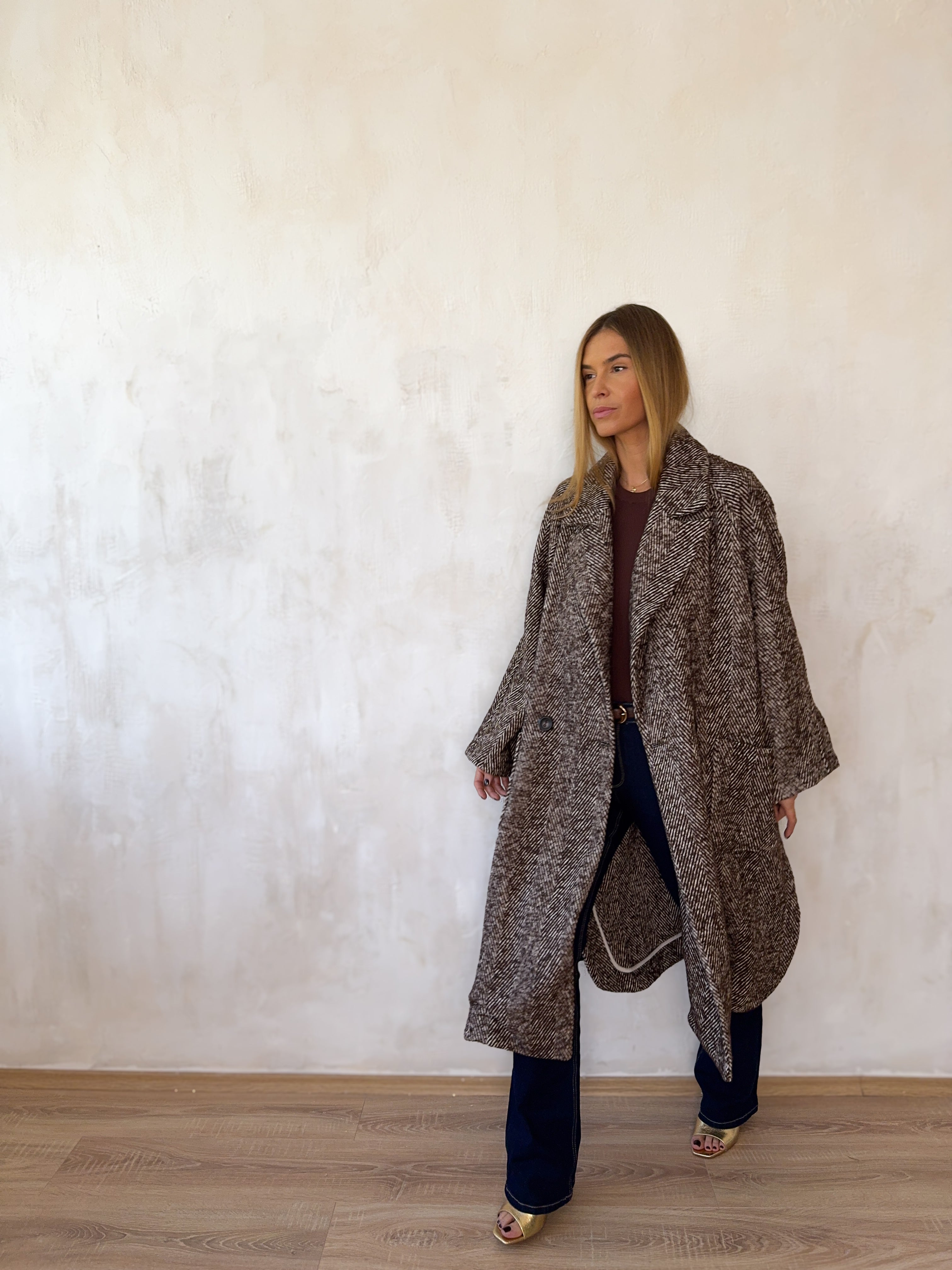 Gyapjúkeverék, oversize fazonú hosszú kabát.