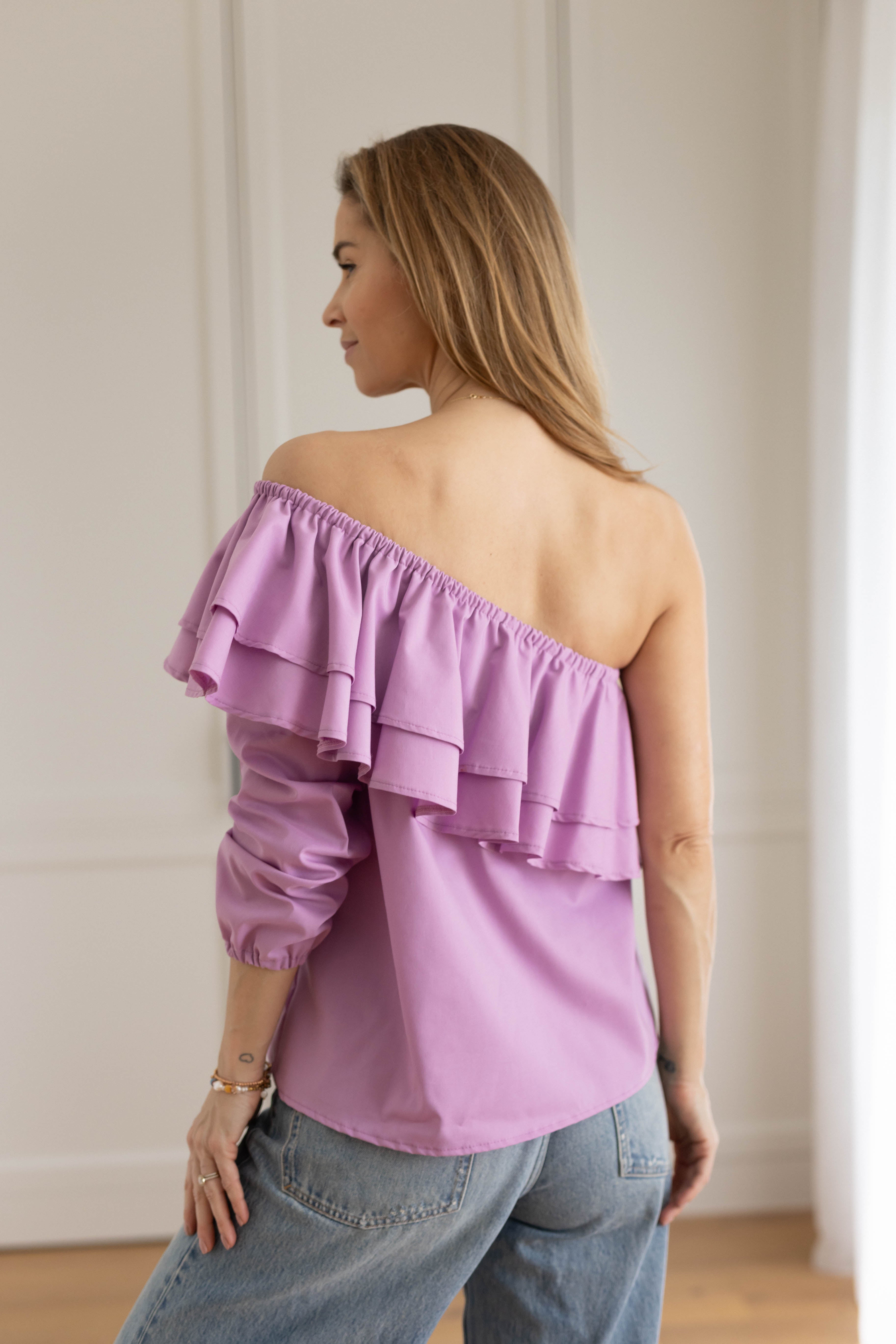 Félvállas, fodros felső.