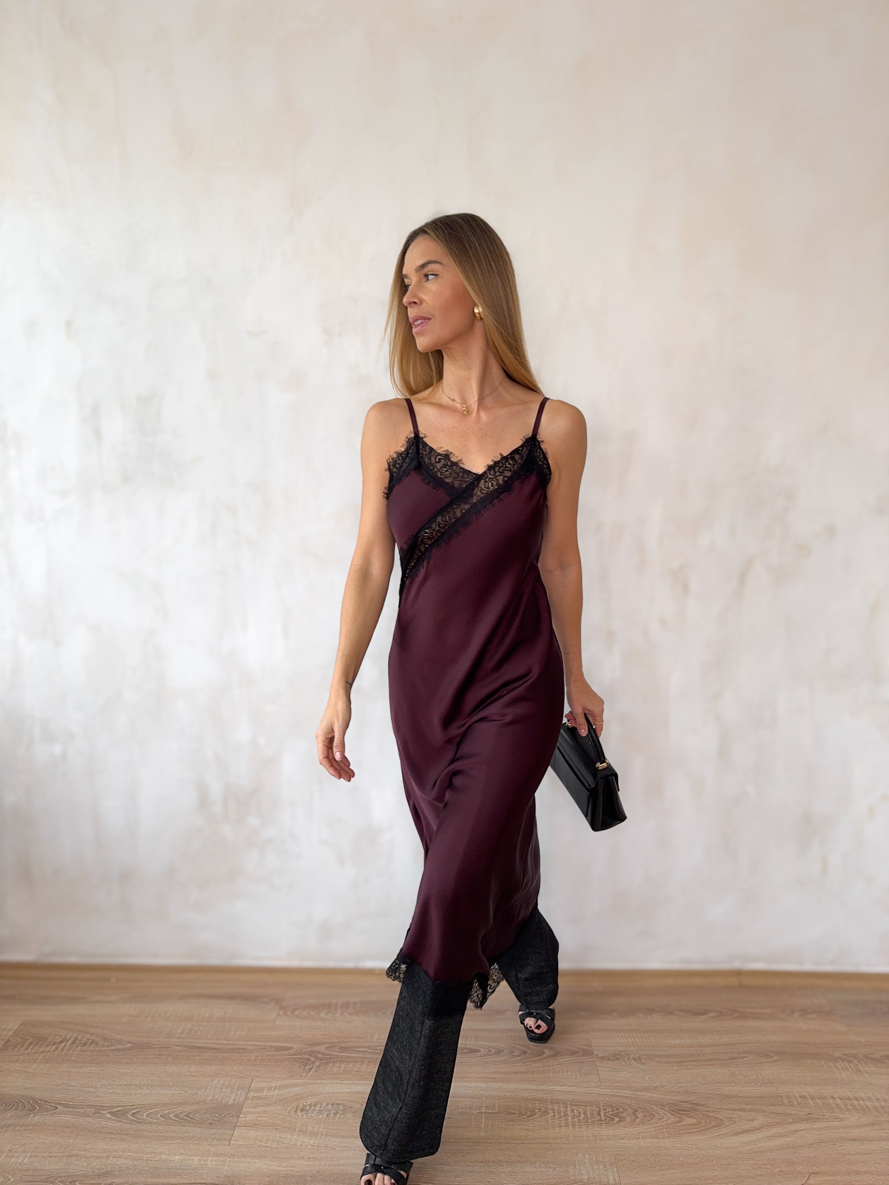Csipkével díszített, lenge anyagú elegáns ruha.