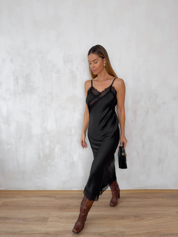 Csipkével díszített, lenge anyagú elegáns ruha.