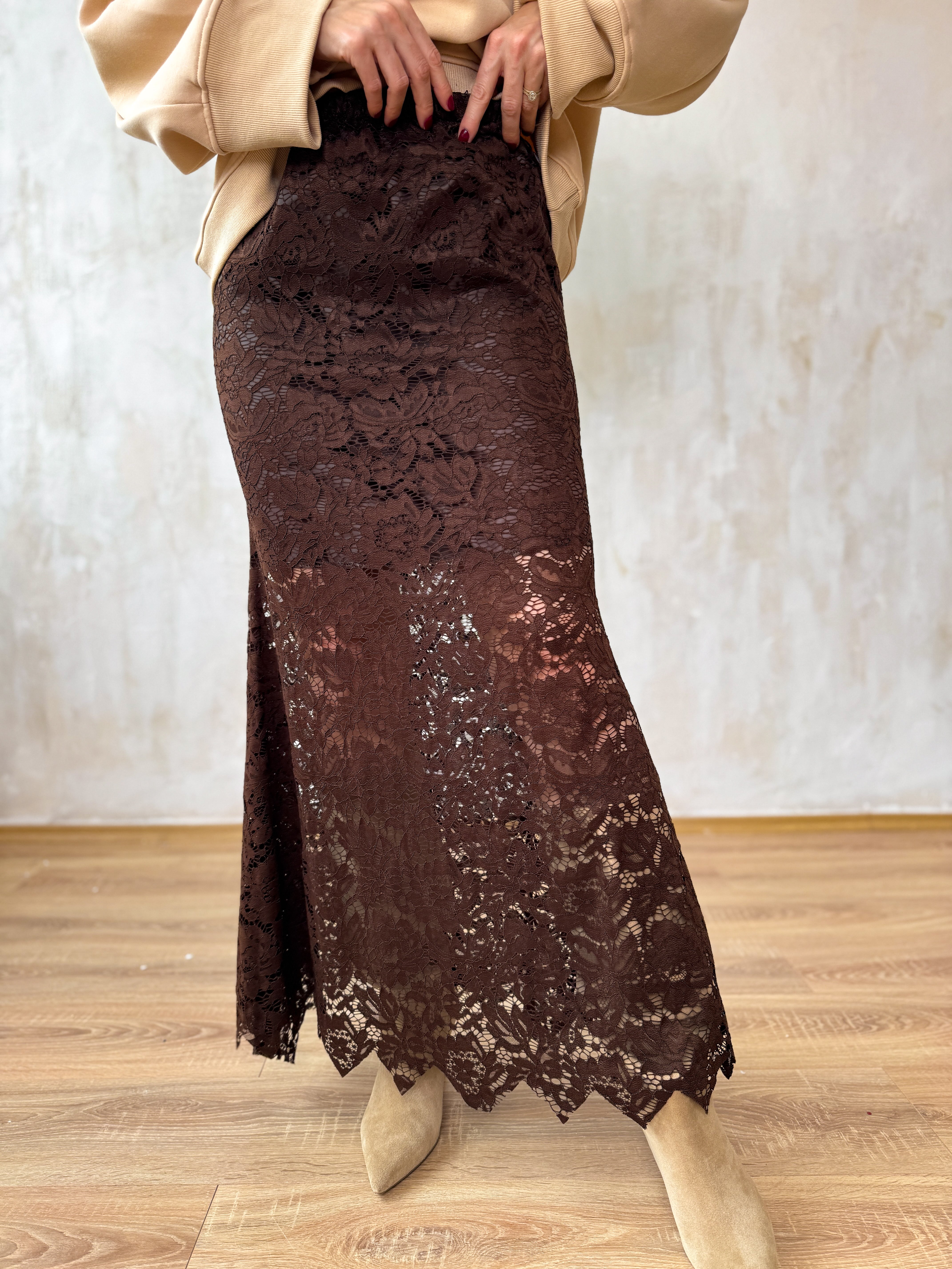 Csipkés, gumis derekú rugalmas, sellő fazonú szoknya.