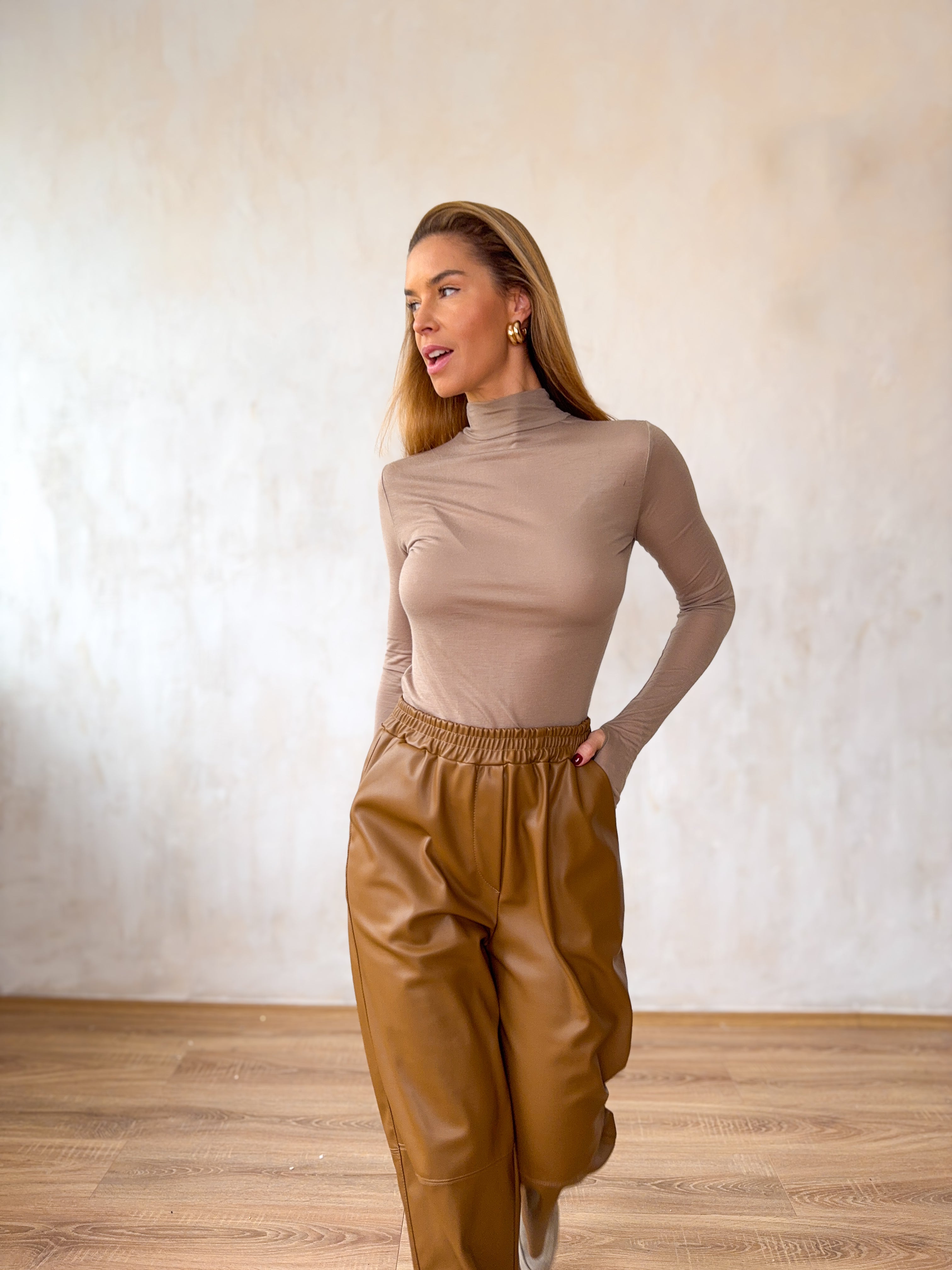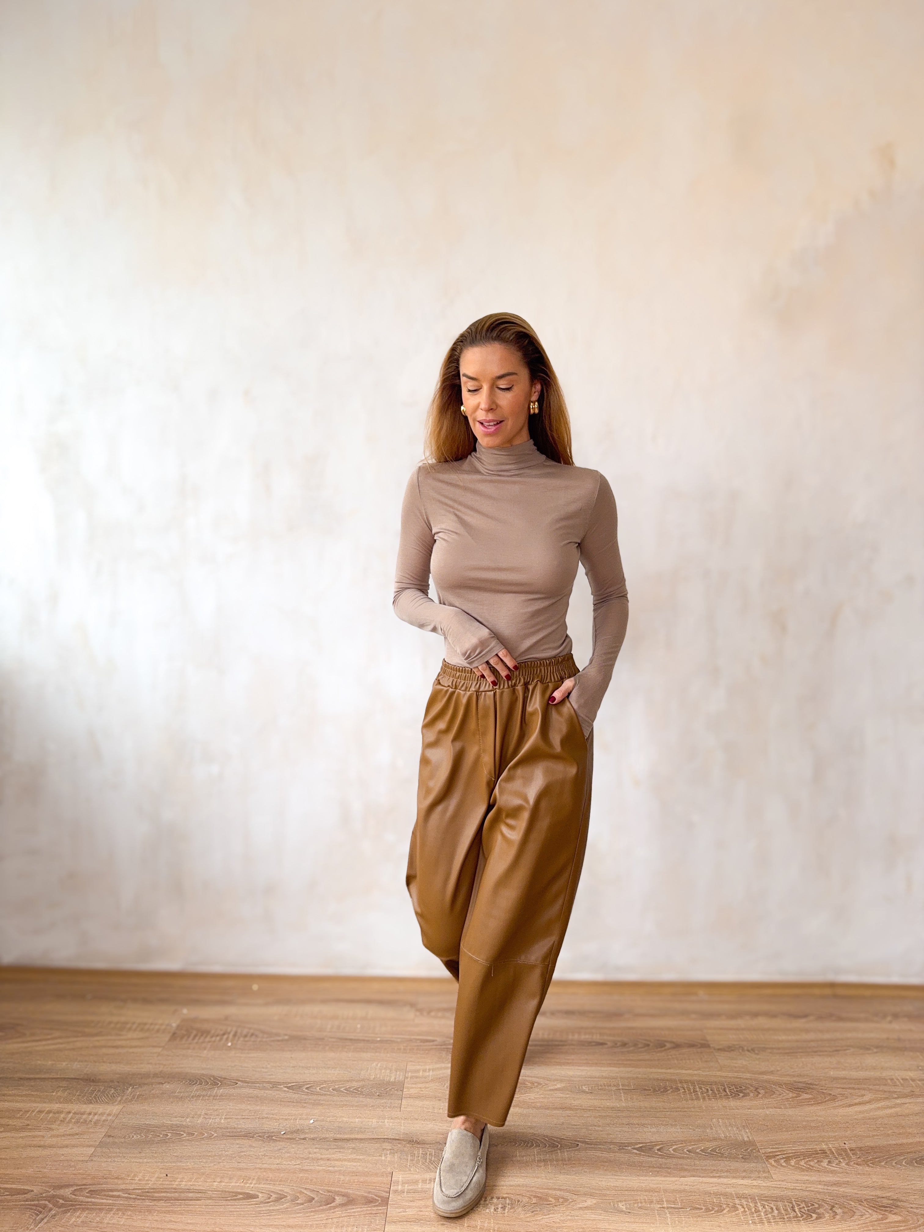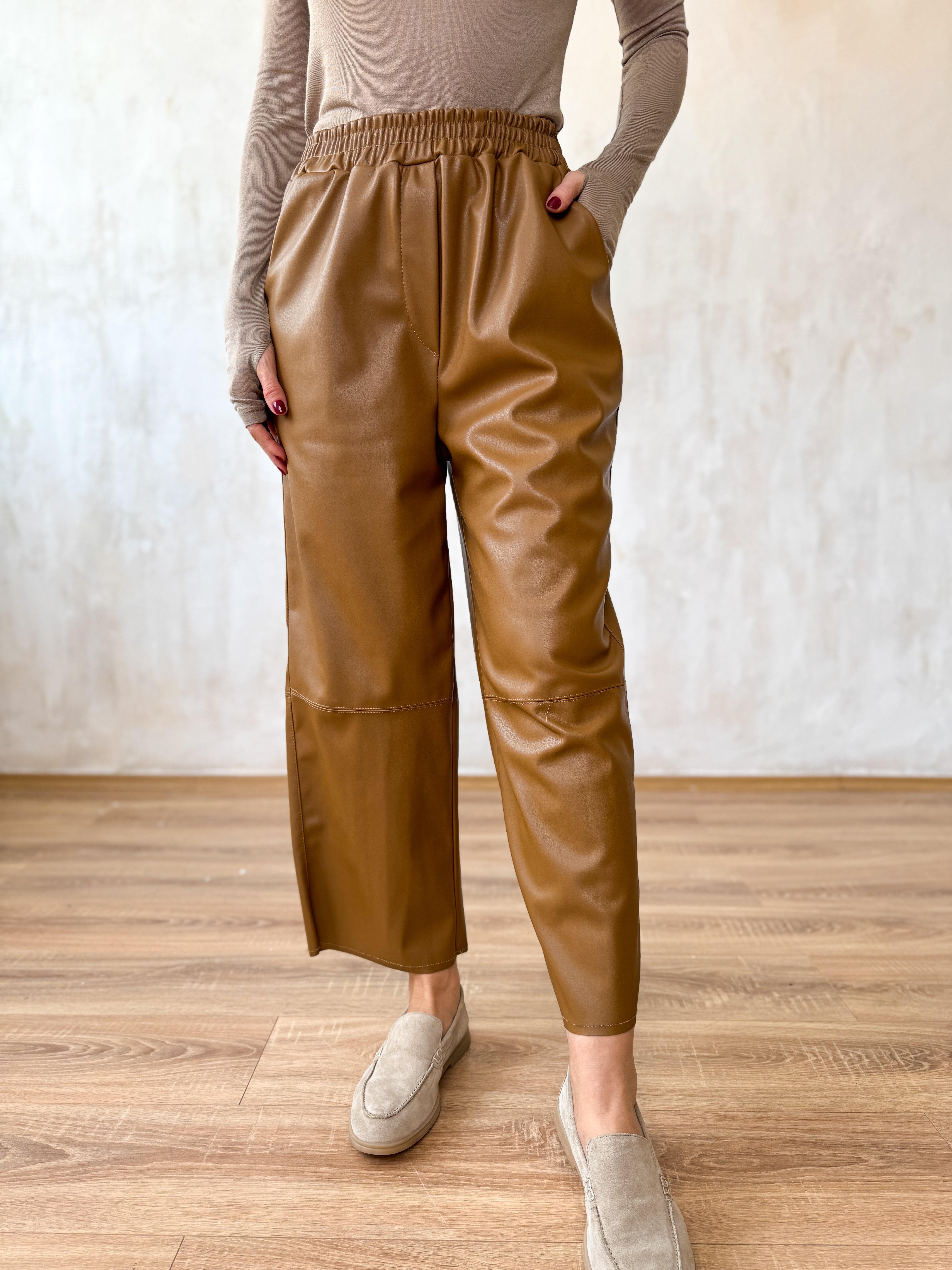 Bőrhatású nadrág egyenes szárral, gumis derékkal.
