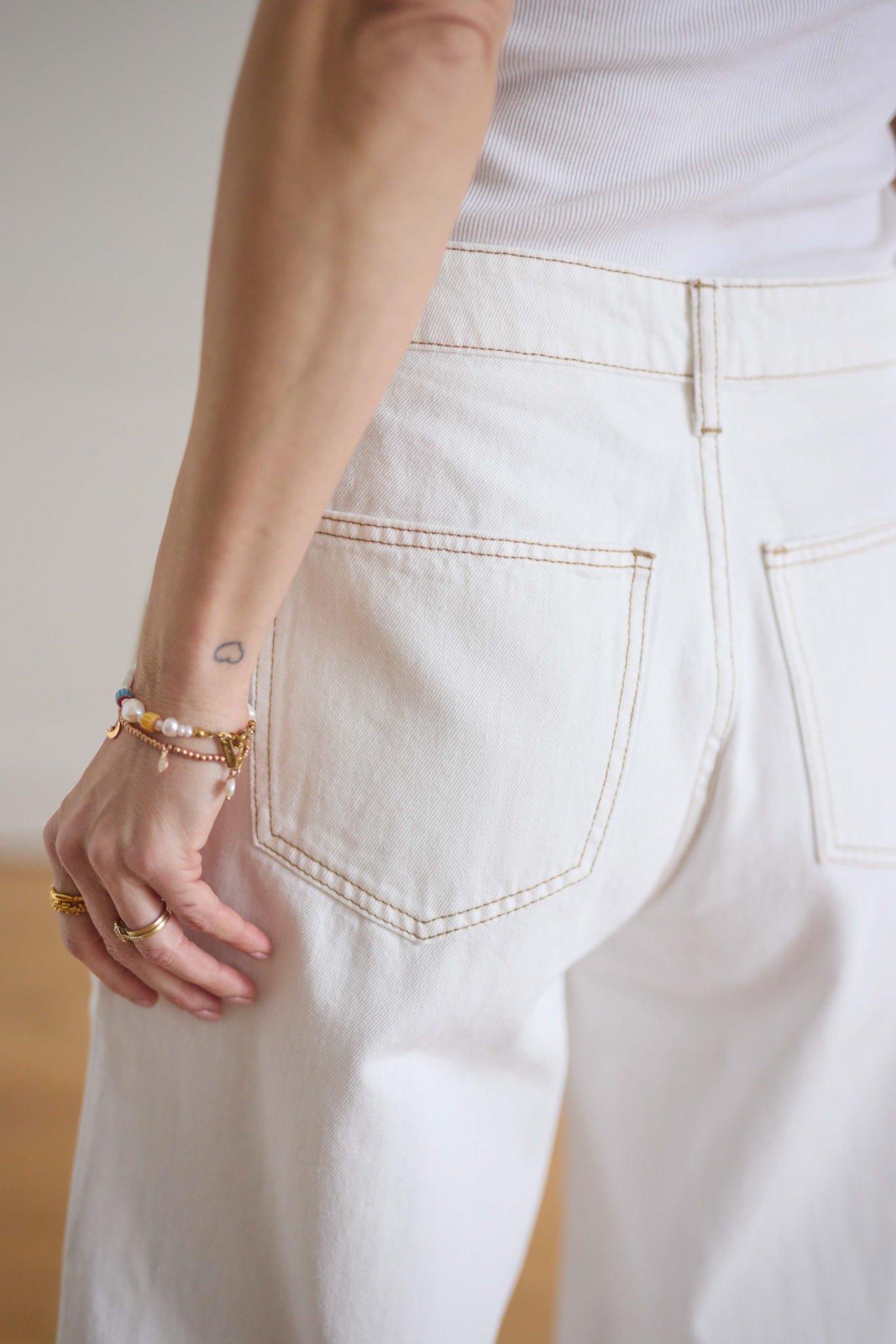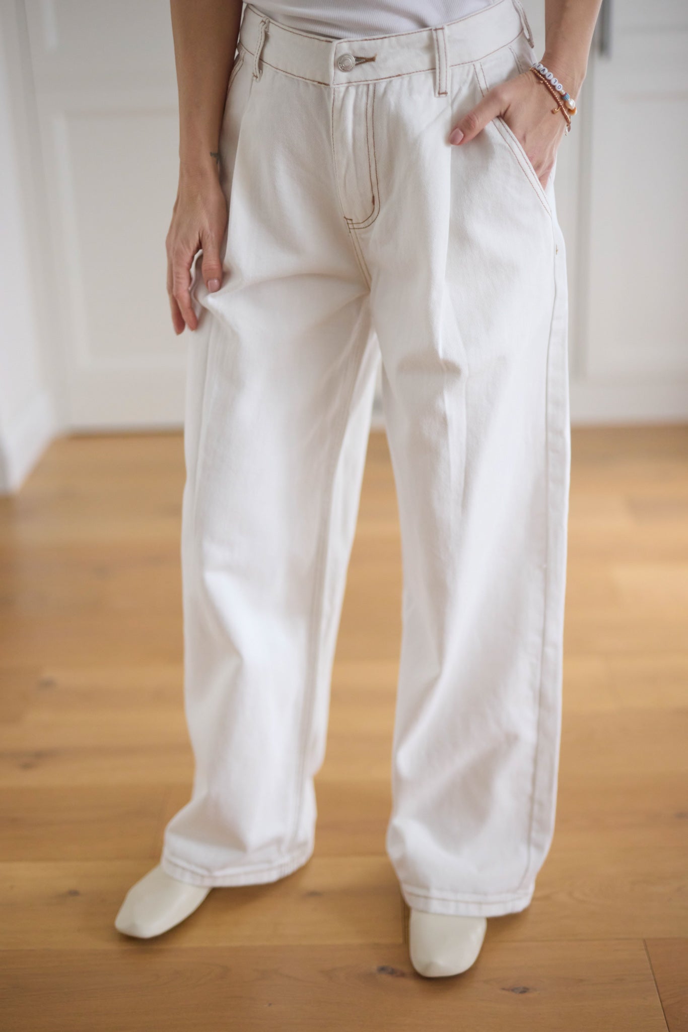 Bő szárú, magas derekú, fehér farmer.