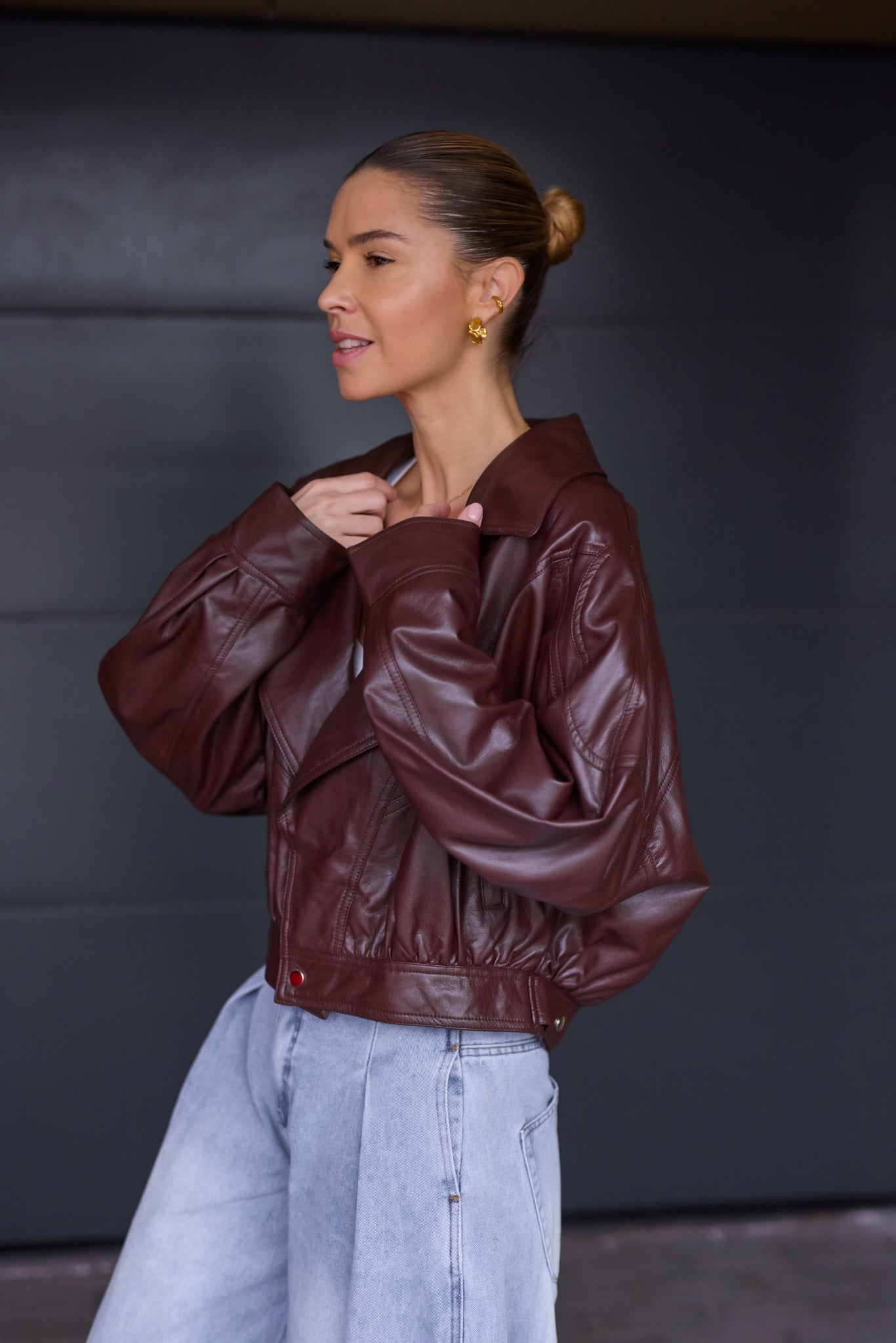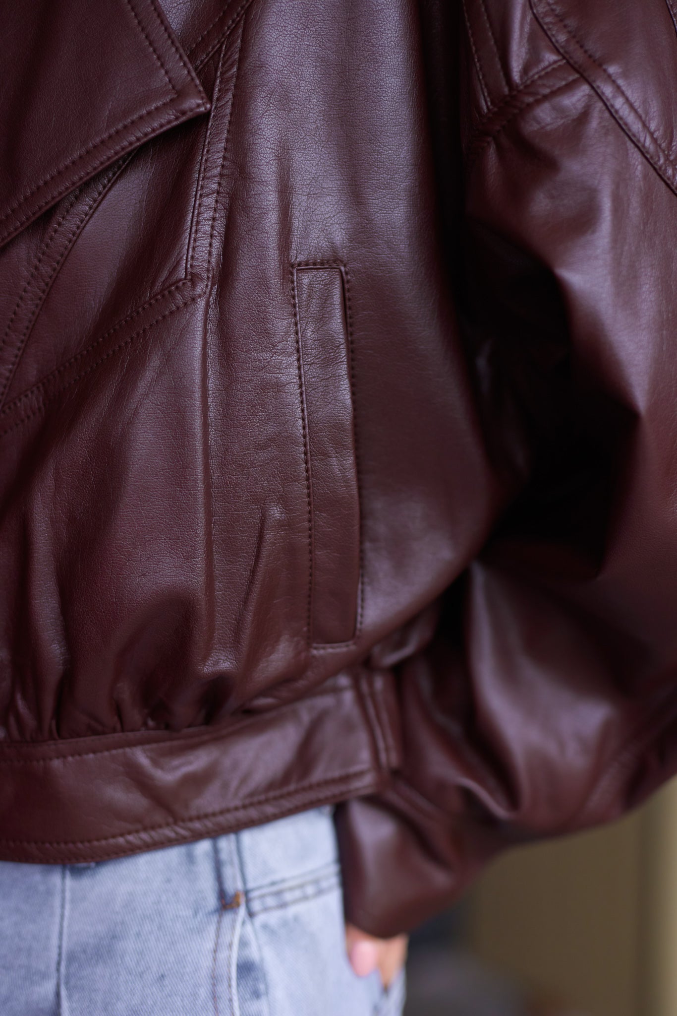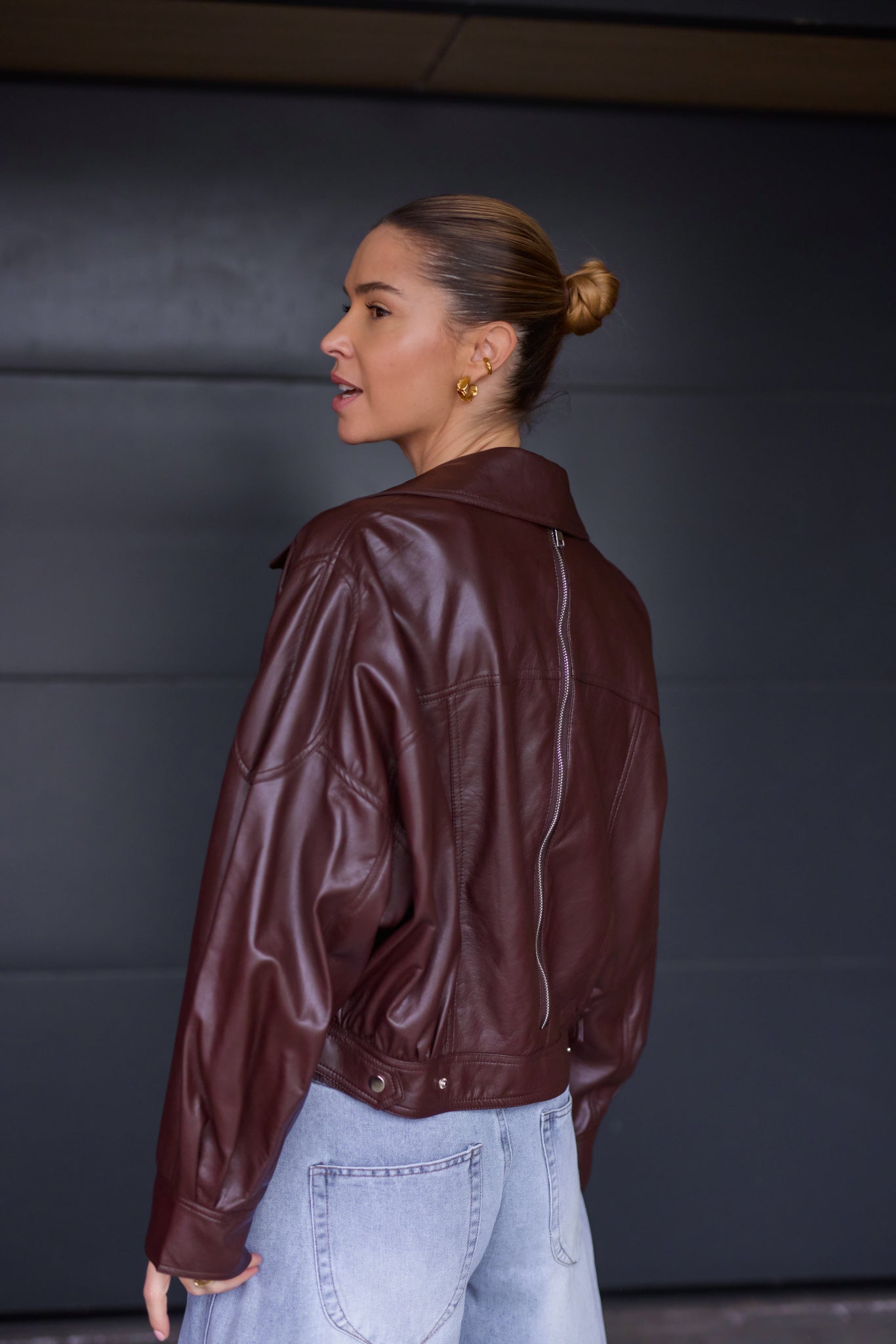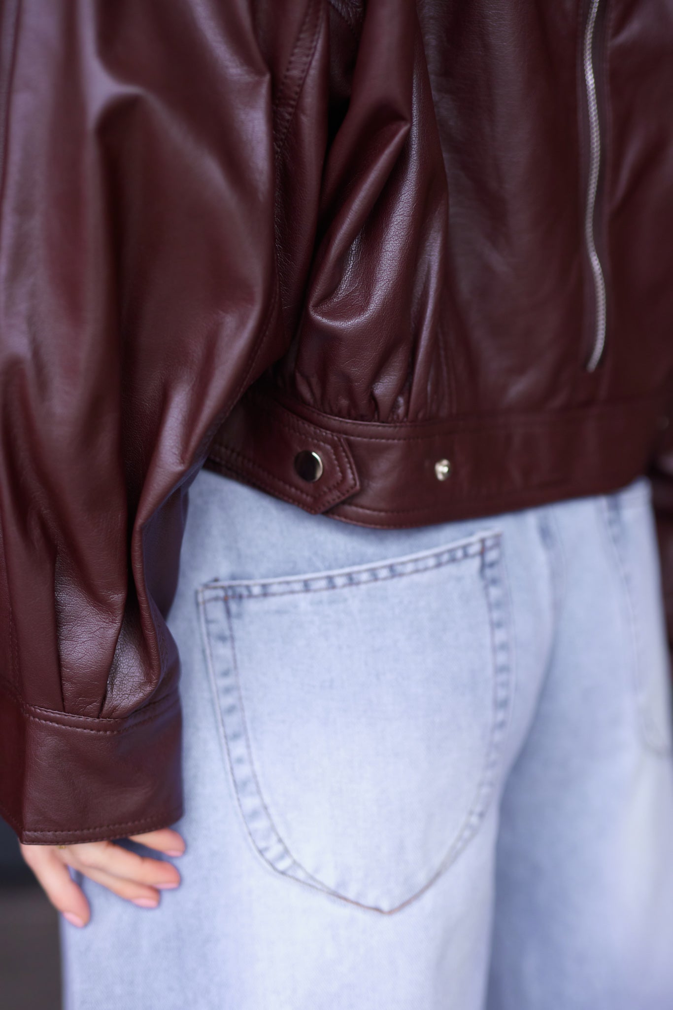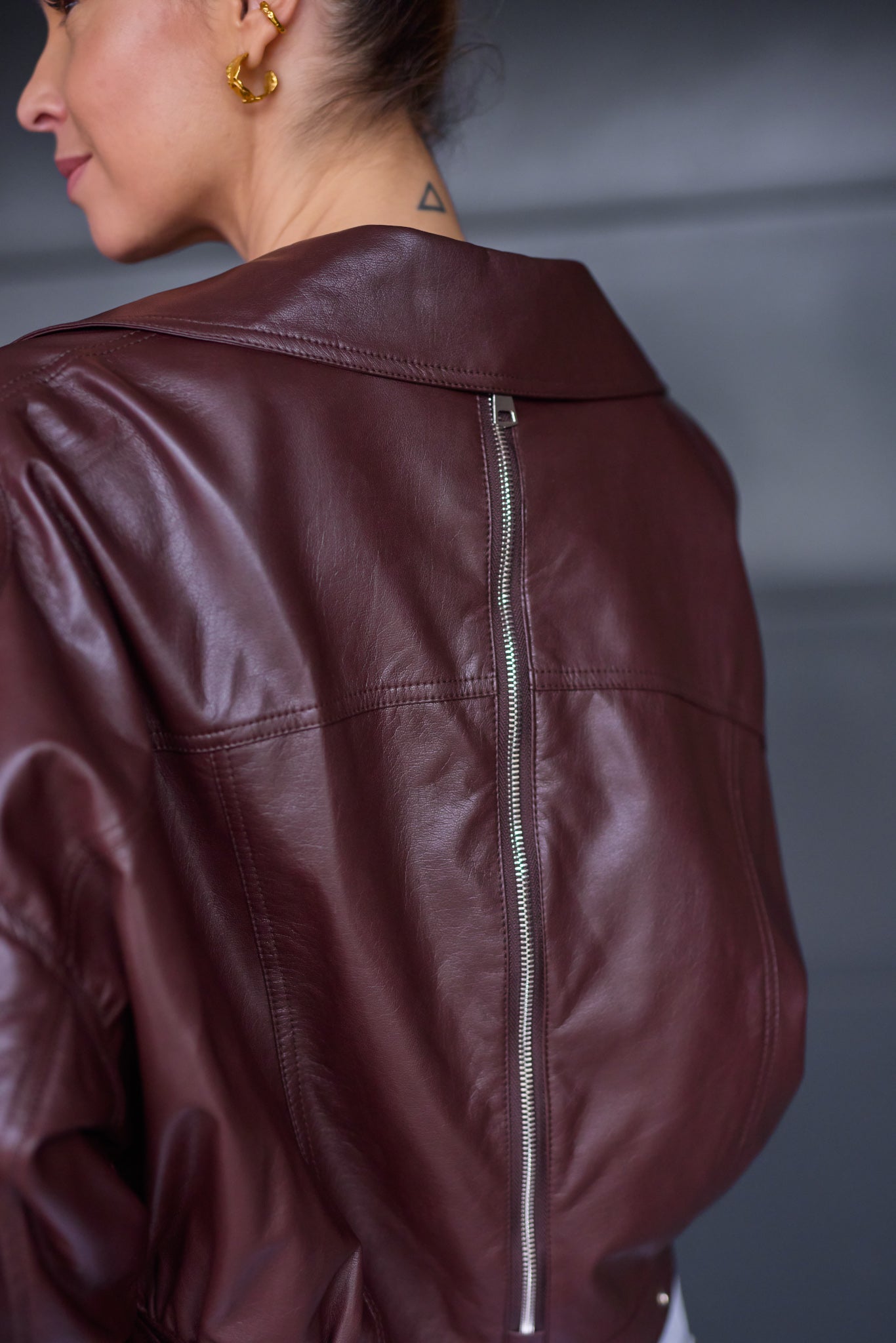 Prémium anyagú, bőrhatású, nagy galléros kabát hátán cipzárral.
