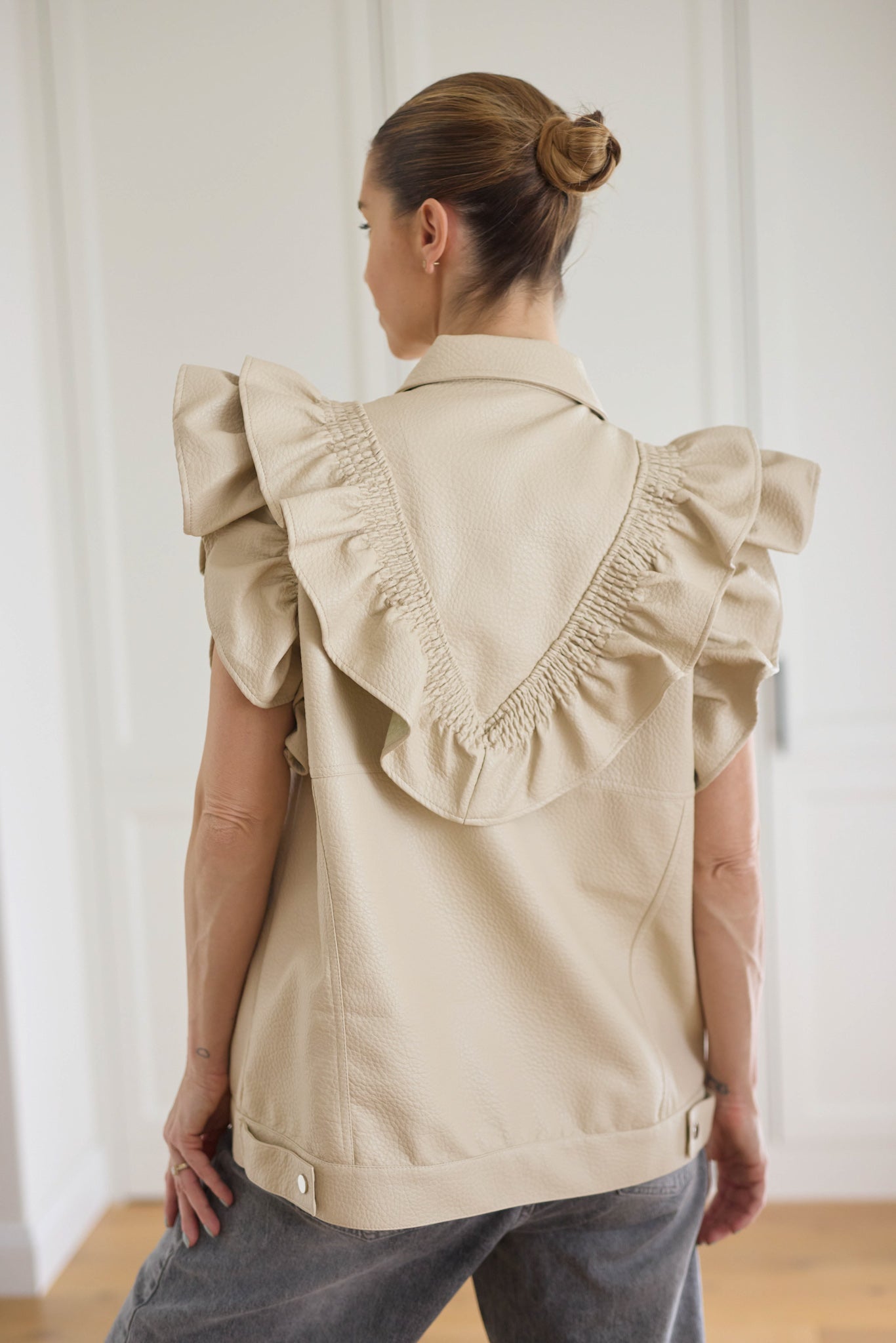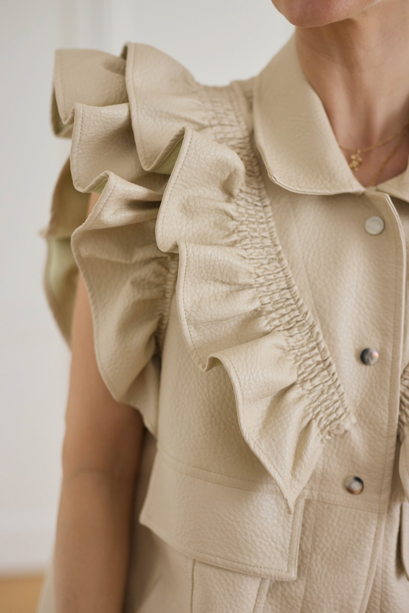 Bőrhatású anyagból készült, fodros vállú mellény.