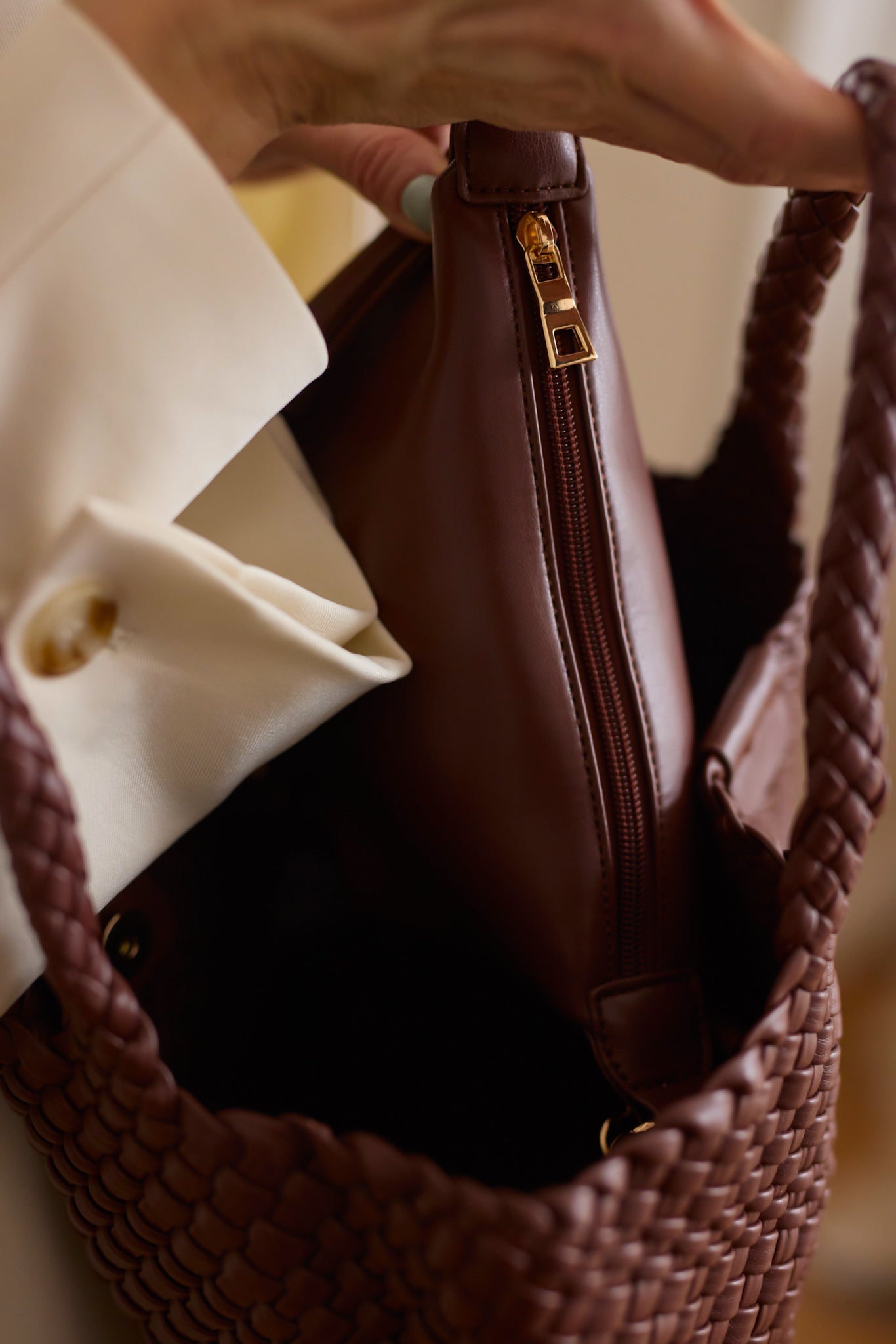 Műbőr anyagból készült táska, amelyhez van egy belső kis táska vállpánttal.