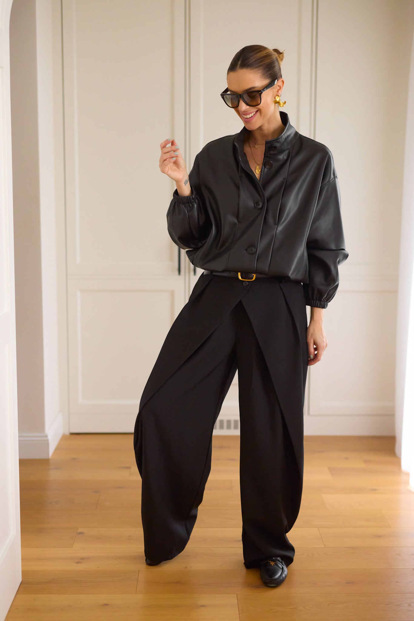 Pasztell sàrga, bő szárú nadrág hajtásokkal.