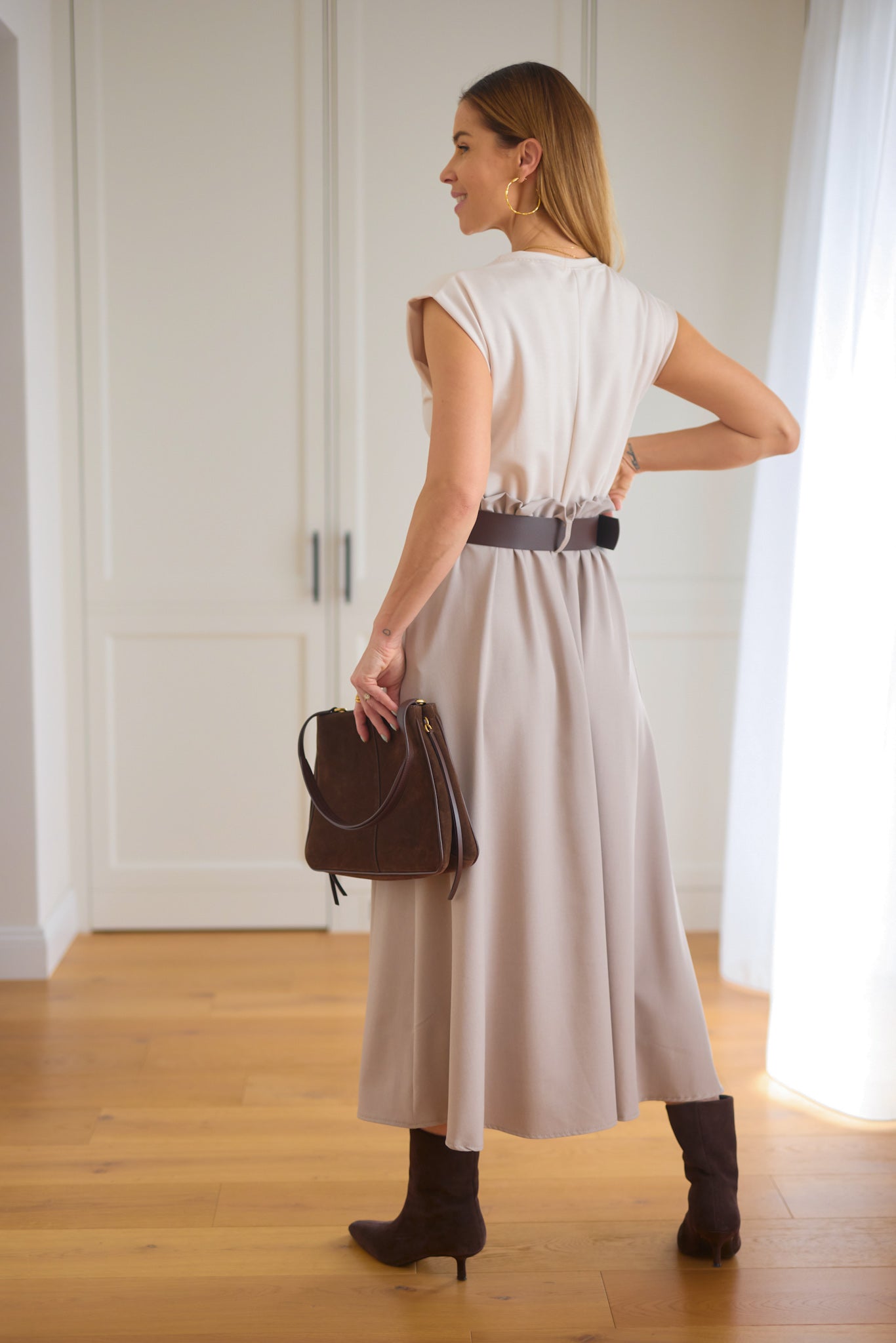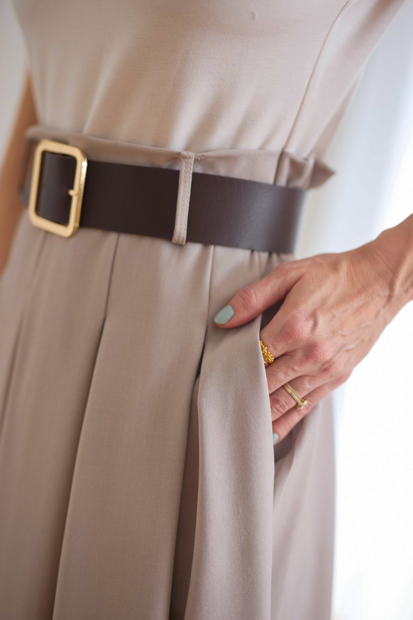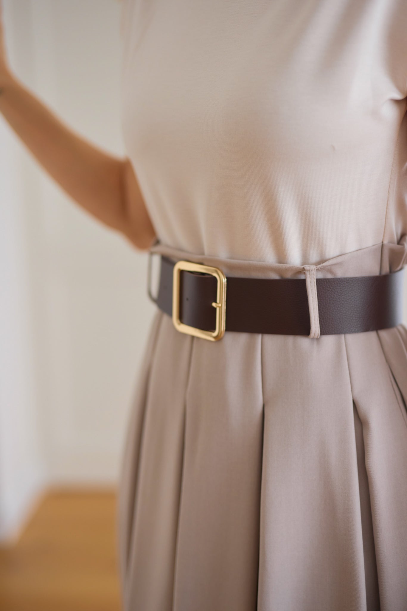 Póló tetejű, "A" vonalú szoknya aljú ruha övvel.