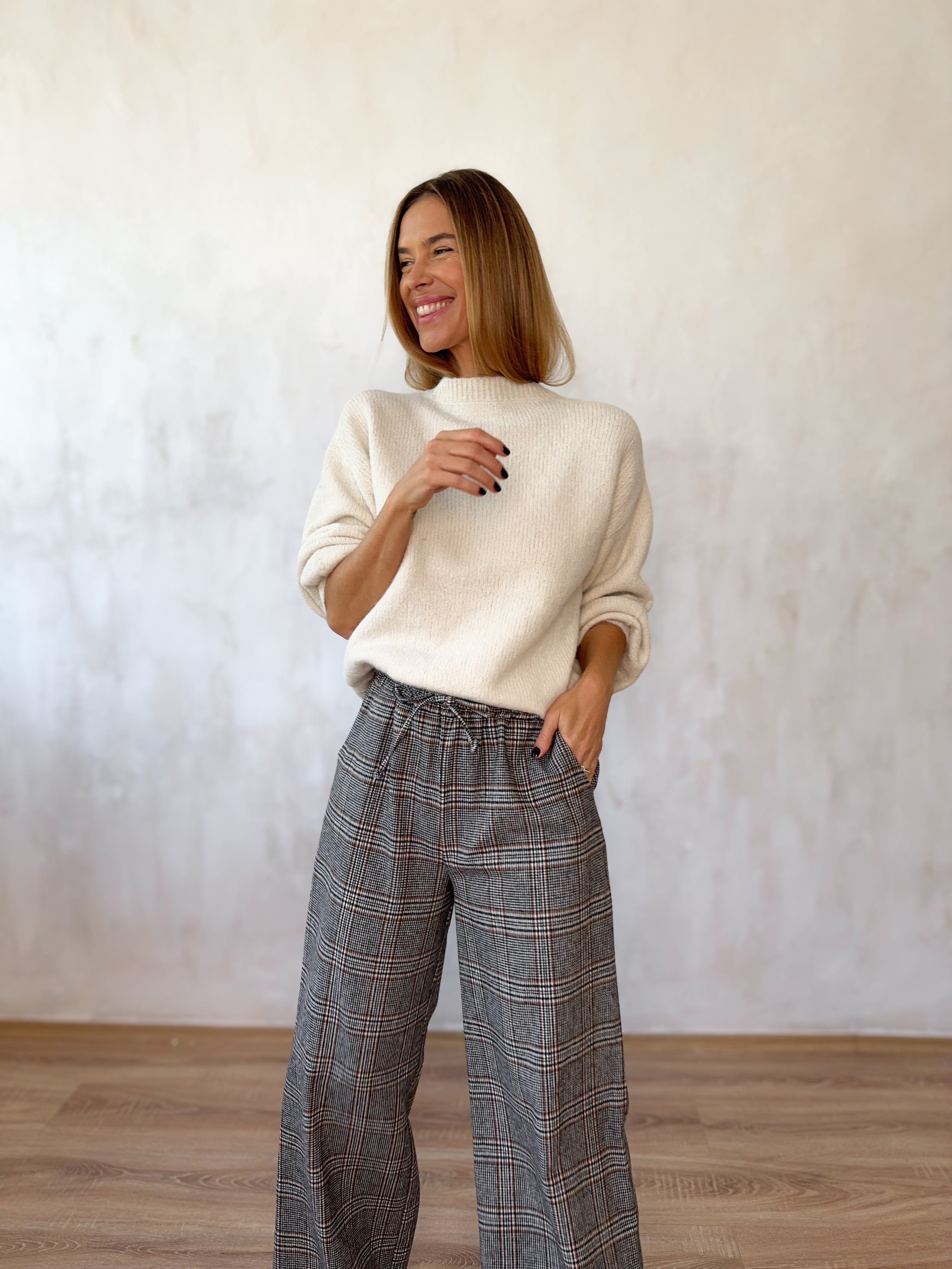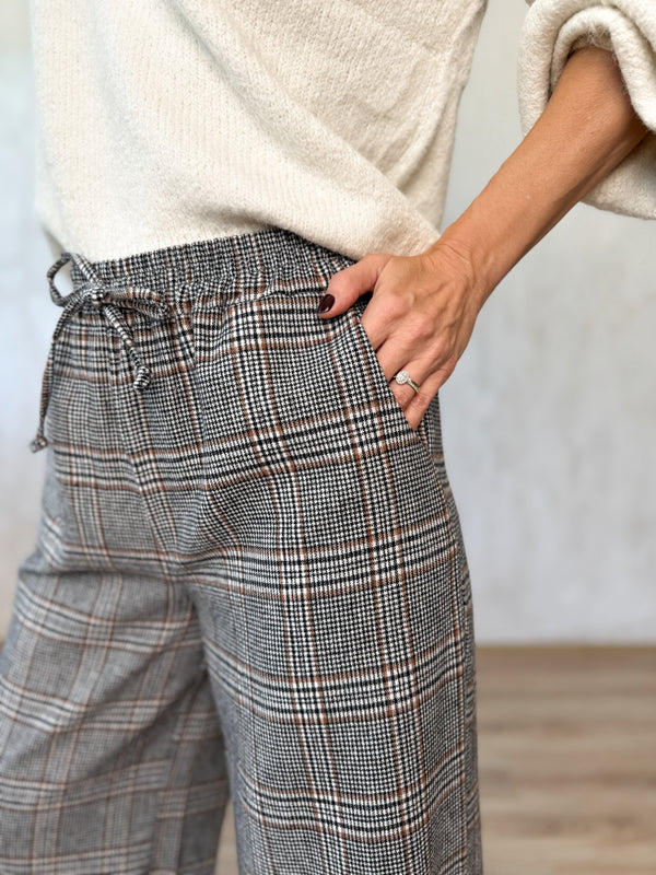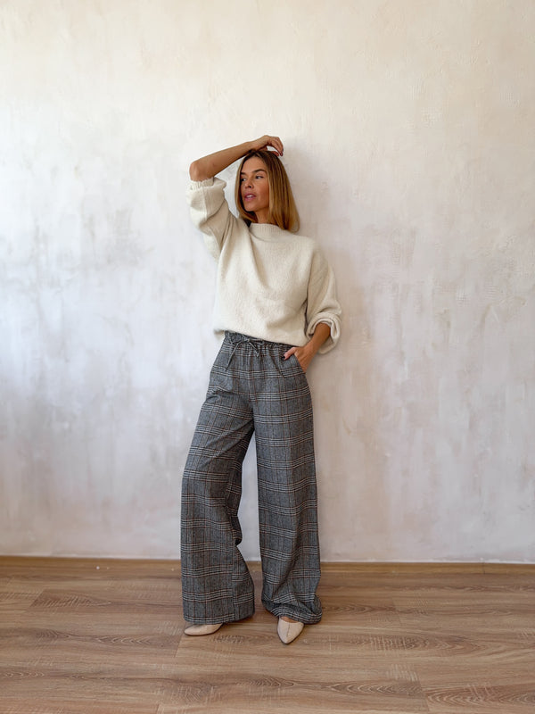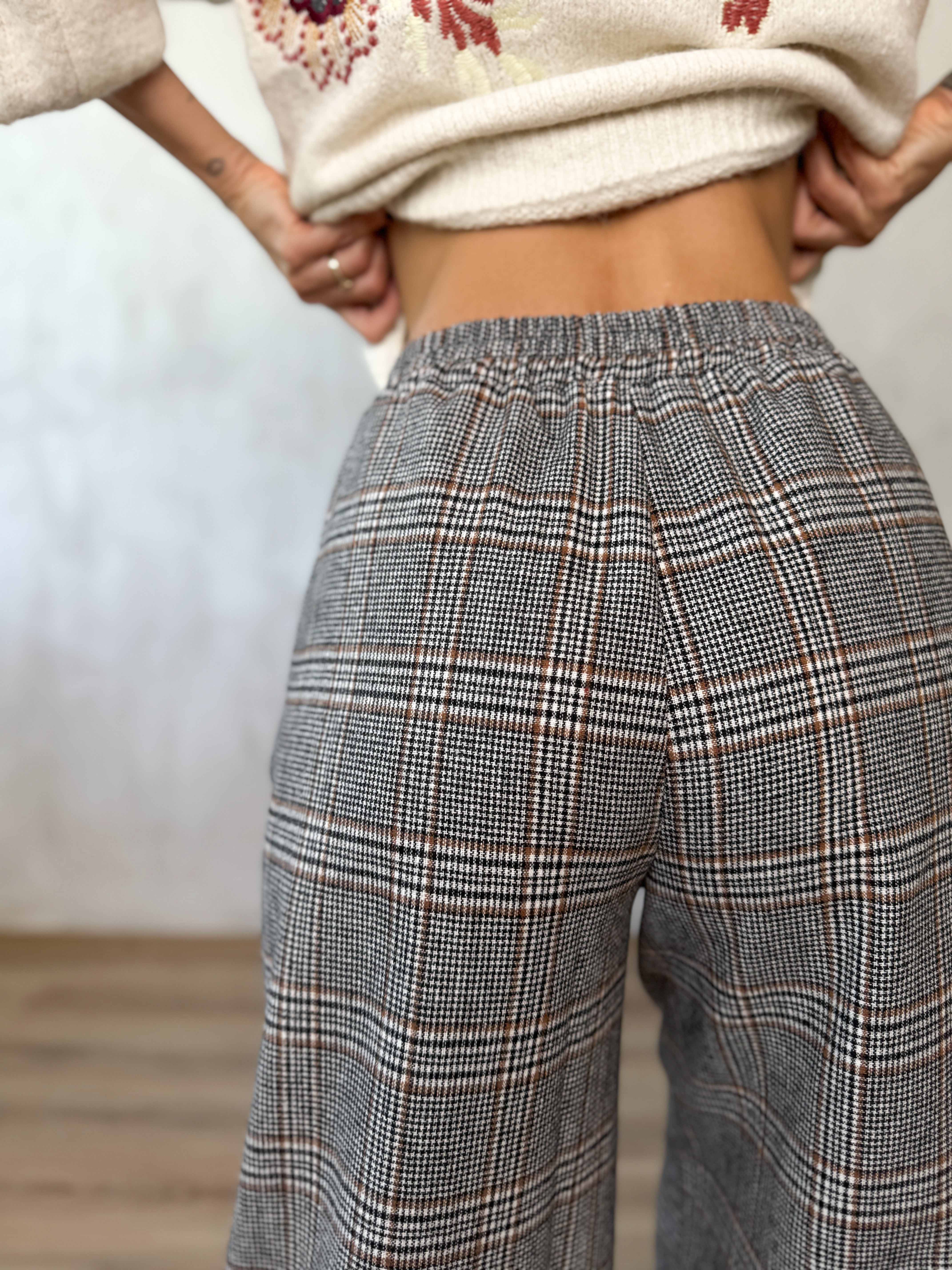 Kockás, gumis derekú megkötős nadrág.
