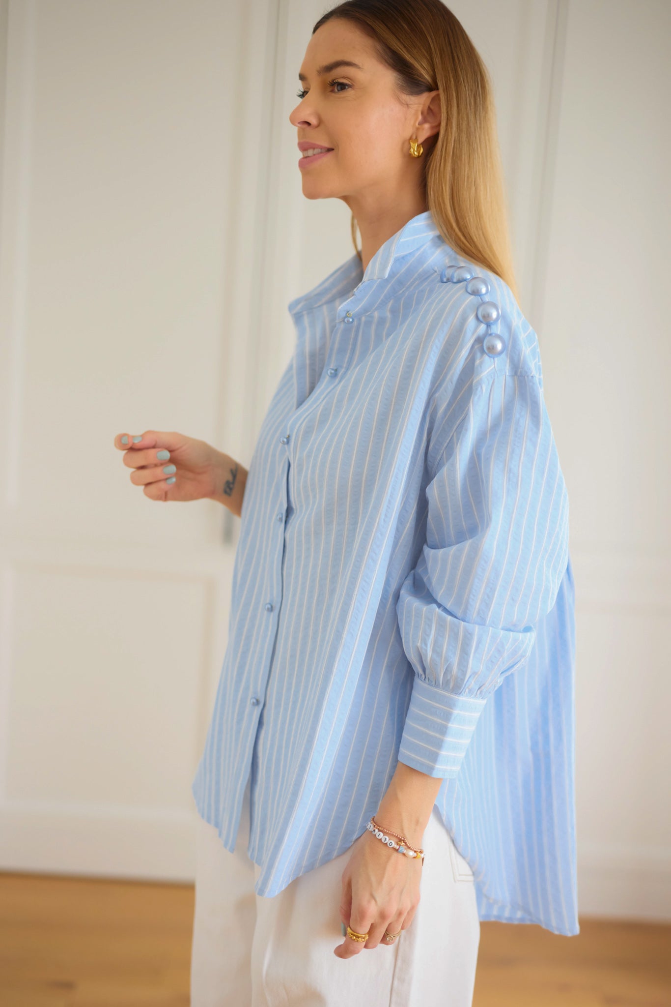 Gyöngyökkel díszített, lenge, bő fazonú ing.