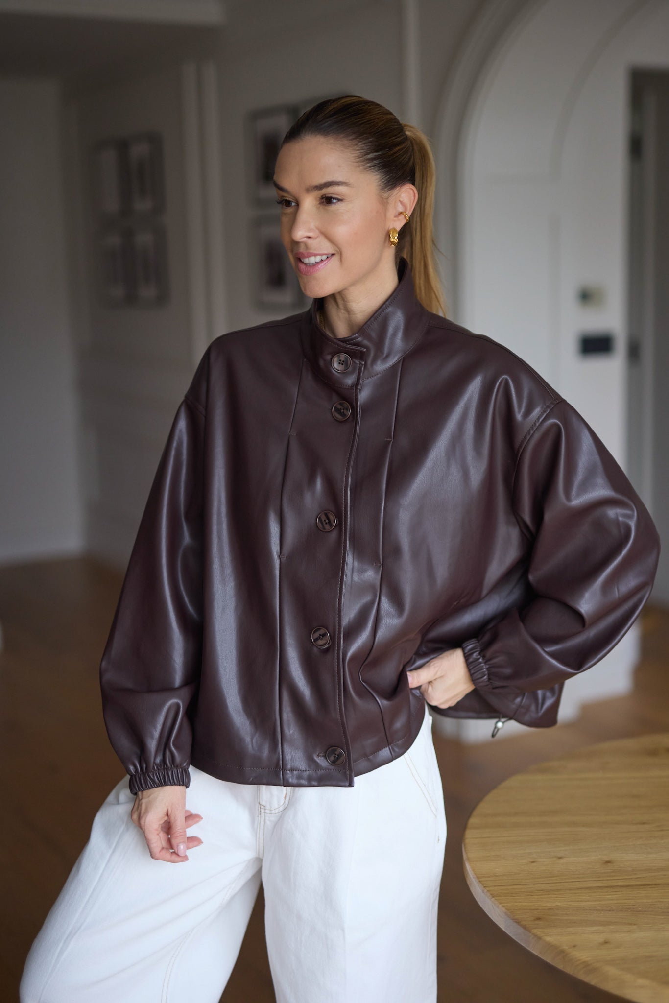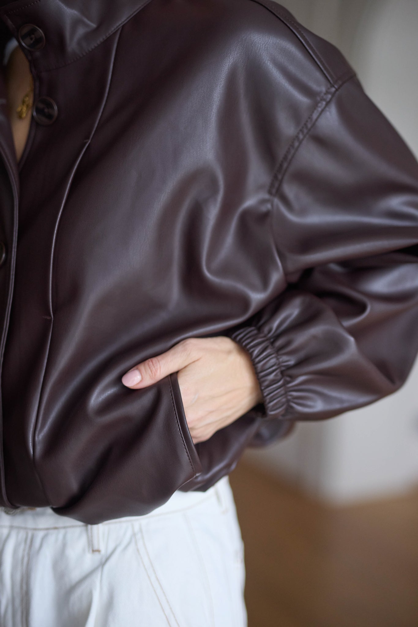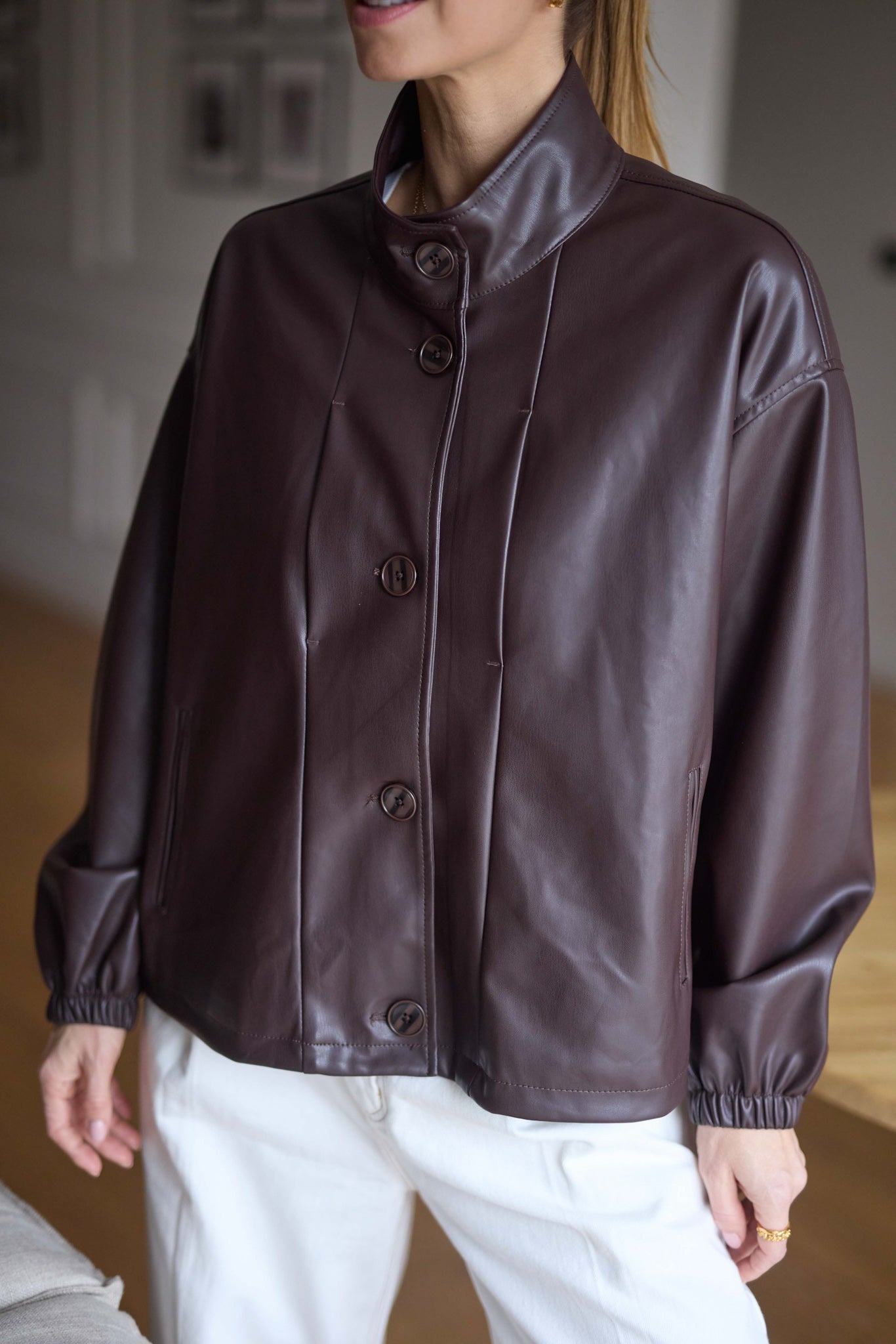 Bőrhatású anyagból készült, behúzható, szűkíthető aljú kabát.