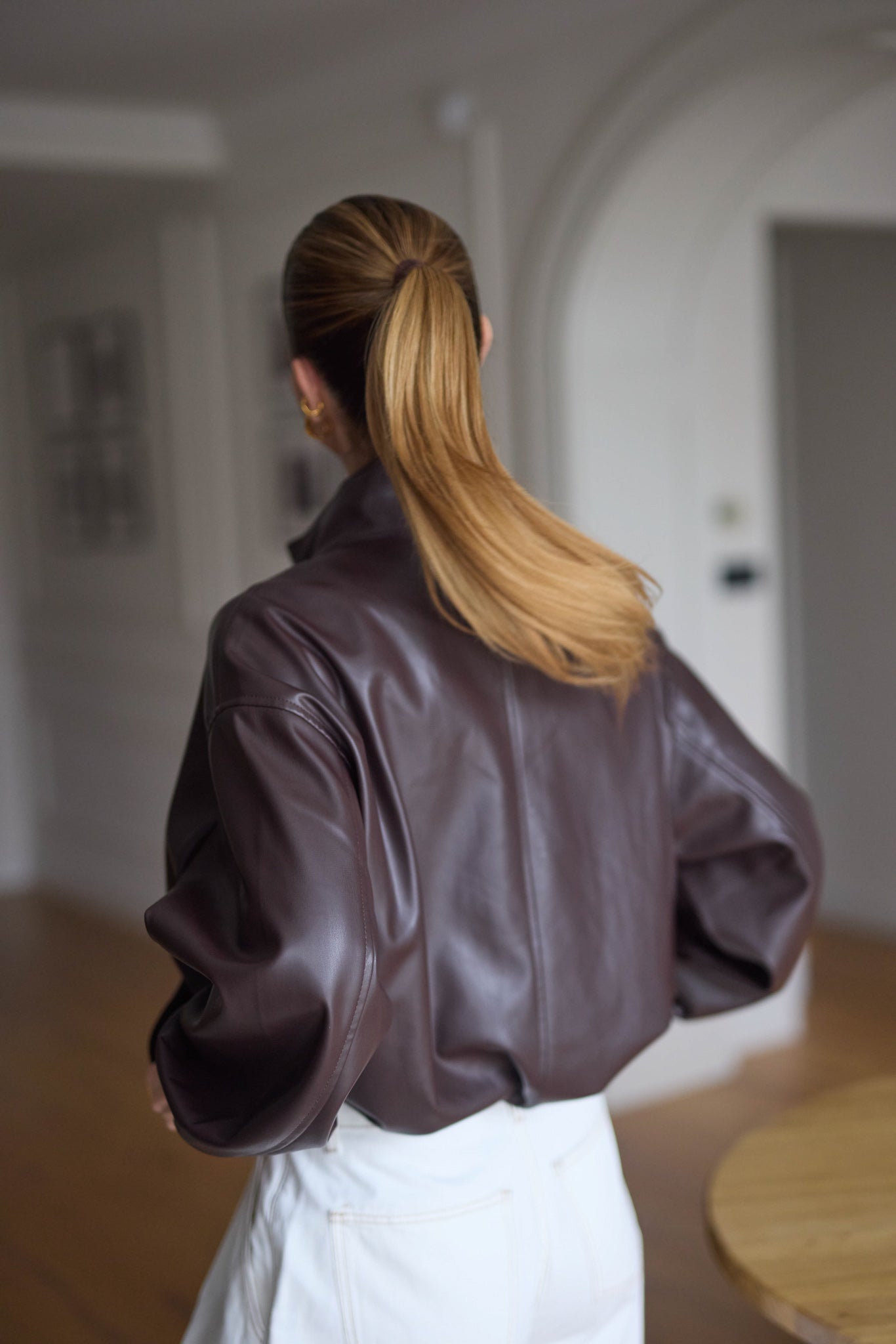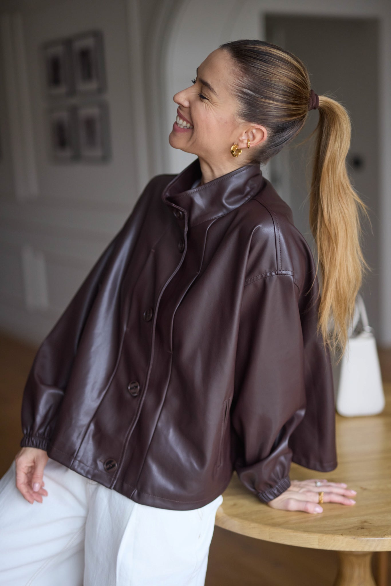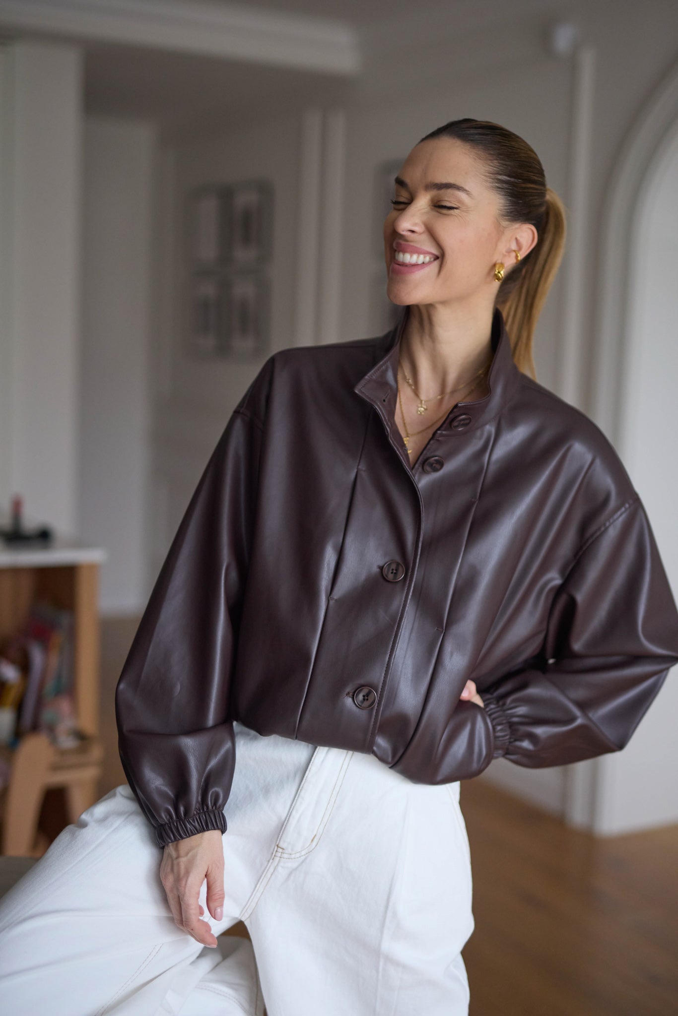 Bőrhatású anyagból készült, behúzható, szűkíthető aljú kabát.